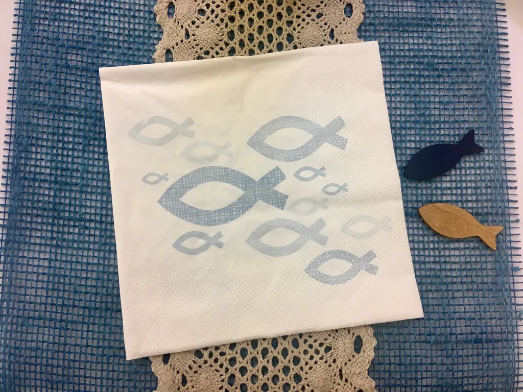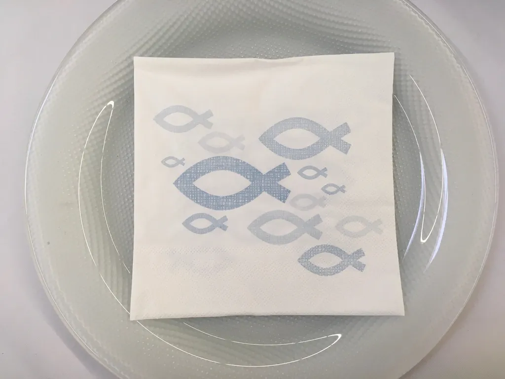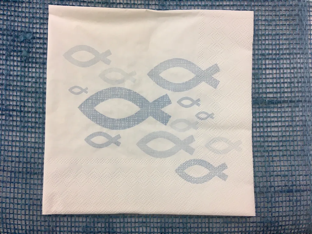 Schlichte hochwertige Papier-Serviette mit stilisiertem Fisch-Aufdruck als christlichem Symbol.