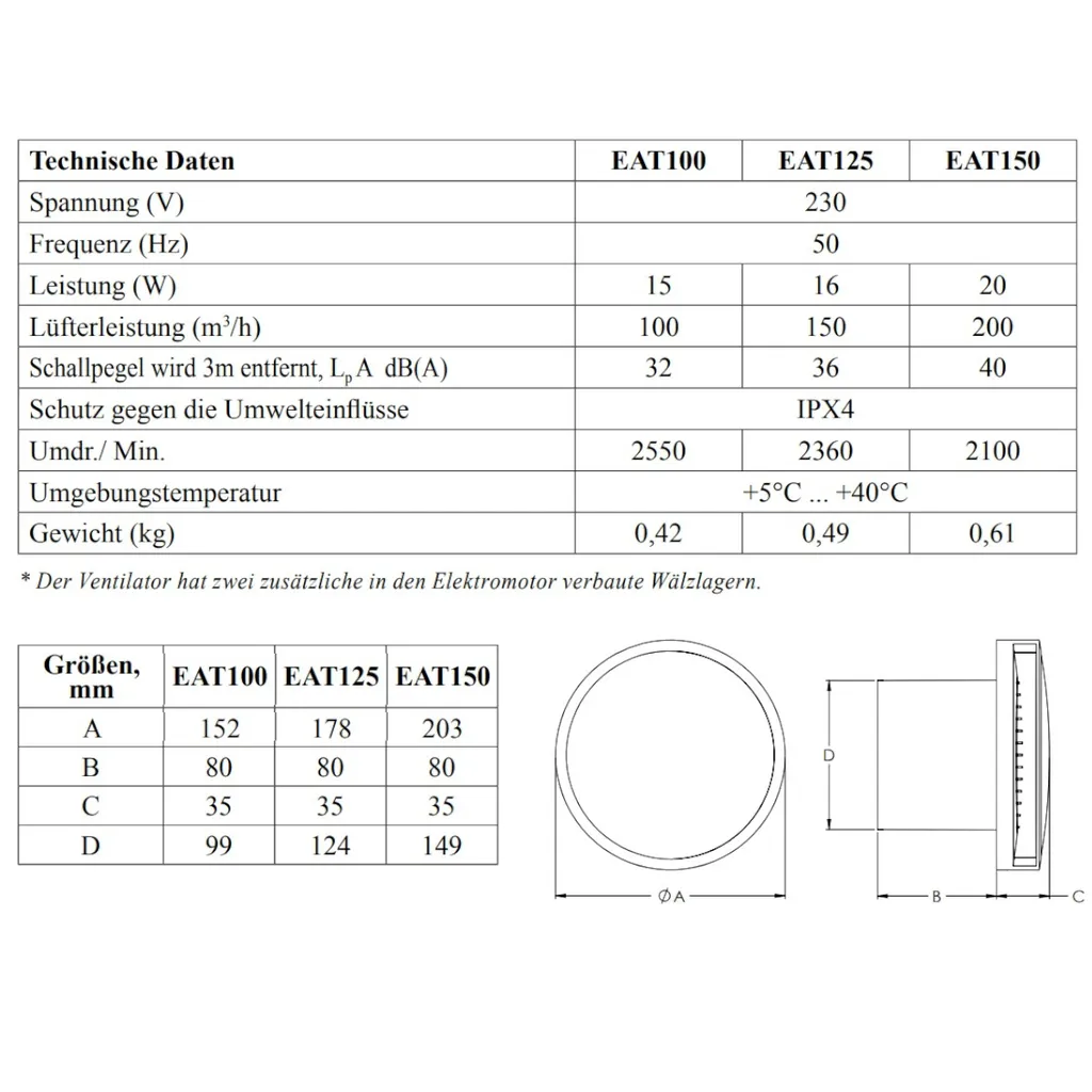 Die Haushaltsabluftventilatoren der Serie EUROPLAST EAT sind mit einer dekorativen Frontplatte ausgestattet. Wirkt ästhetischer und hebt sich weniger von der Raumgestaltung ab. Ventilatoren sind effizient, einfach zu installieren und zu verwenden.Diese Ventilatoren sind mit einem Kugellager ausgestattet um eine bessere Leistung, Haltbarkeit und die Möglichkeit zu bieten, sie sowohl in Wänden als auch in Decken zu installieren. Das Lüftergehäuse, das Gitter und das Frontplatte bestehen aus hochwertigem und langlebigem ABS-Kunststoff, der temperatur- und UV-beständig ist. Ventilatoren von EUROPLAST sind sicher, weil ihr Motor eine Thermosicherung hat. Der Lüftermotor ist mit einem Kugellager ausgestattet, was für einen besseren Lüfterbetrieb und auch Langlebigkeit sorgt. Dank Kugellager kann der Ventilator auch zur Deckenmontage verwendet werden. Der Lüfter wird mit einem Feuchtigkeitsstandregler ausgestattet, mit dem der Feuchtigkeitsgrad von 60%RH bis 90%RH sowie Verzögerungszeit-Controller von 1 bis 30 Min einstellbar sind. Der Lüfter schaltet sich automatisch zum Zeitpunkt ein, wenn im Raum ein bestimmter Feuchtigkeitsgrad erreicht wird oder, wenn man den Schalter eingeschaltet. Das Gerät ist mit einer Zeitschaltuhr ausgestattet. Nach dem Ausschalten des Lüfters läuft der Timer für eine bestimmte vom Controller eingestellte Zeit weiter. Die Betriebsdauer nach dem Ausschalten des Lüfters kann von 1 bis 30 Minuten eingestellt werden.