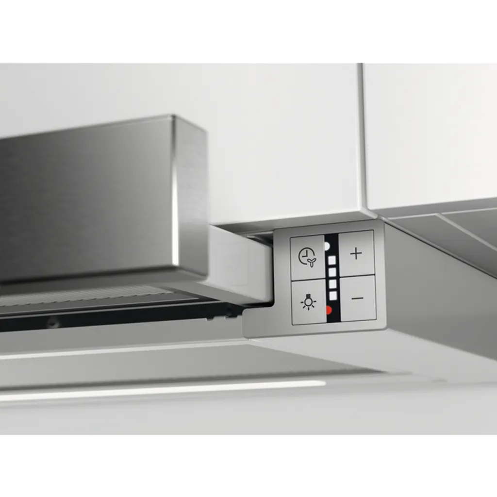 Mittels der elektronischen Tasten lassen sich alle Funktionen der Dunstabzugshaube vornehmen – von der Änderungen der Gebläsegeschwindigkeit bis hin zur Anpassung der Lichteinstellug.
