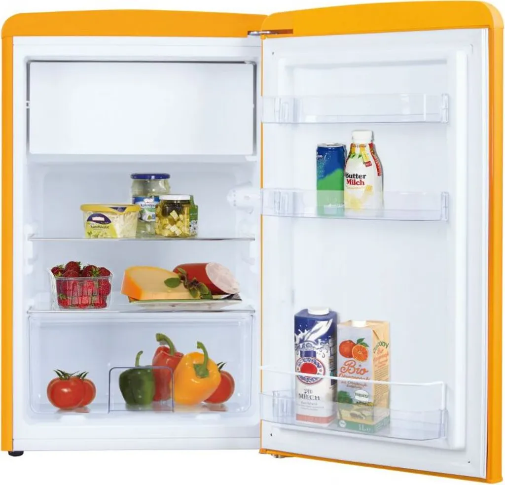 RETRO Kühlschrank, Lagerzeit bei Störung: 11 Std., Gefriervermnögen: 2 kg/24 Std., Kühlteil: 1 Glasablage (Sicherheitsglas), verstellbar, 1 transparente Obst- und Gemüseschale mit Glasablage, 3 transparente Türablagen, 1 Eiertablett, Gerätegewicht: 28 kg