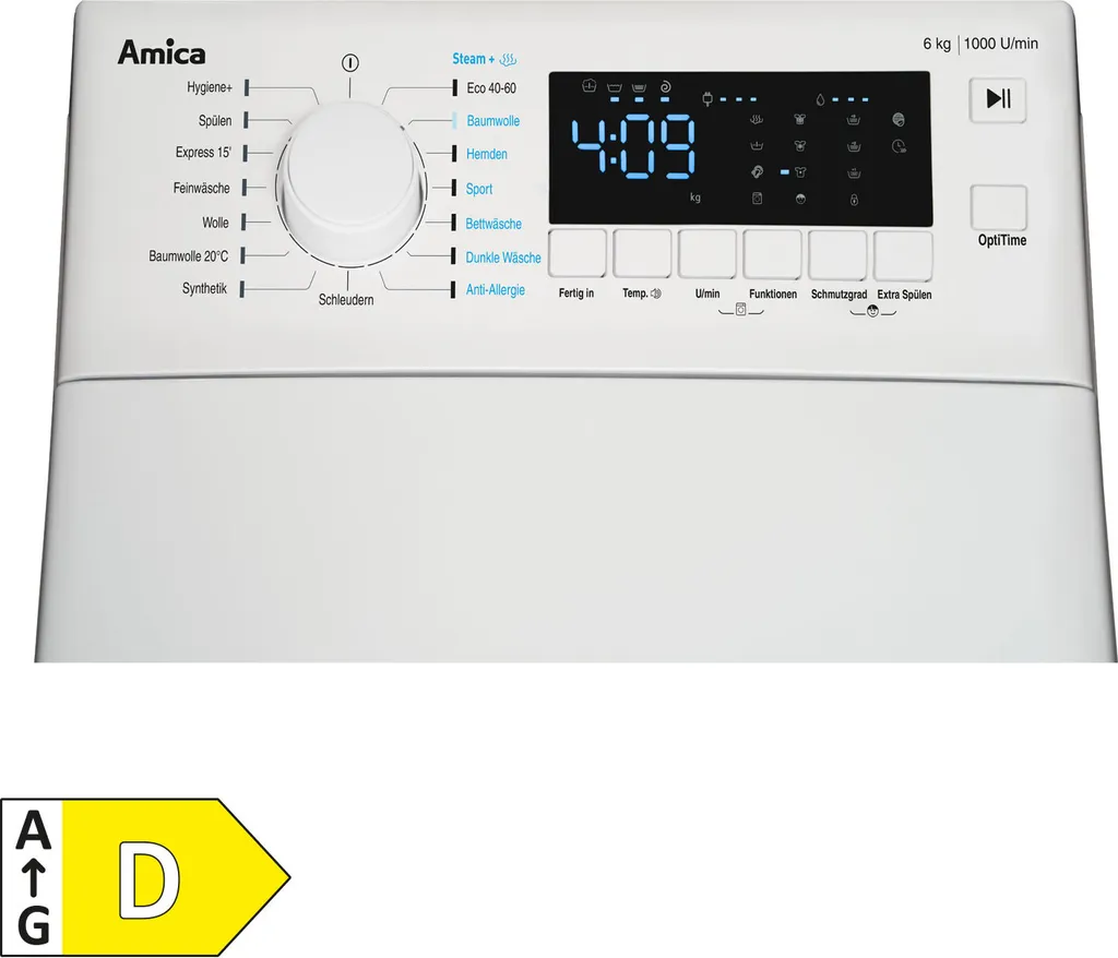- Zusatzfunktionen: Fertig in, Schleuderwahl, Temperaturwahl, Funktionen, Schmutzgrad, Extra Spülen, OptiTime, Start/Pause