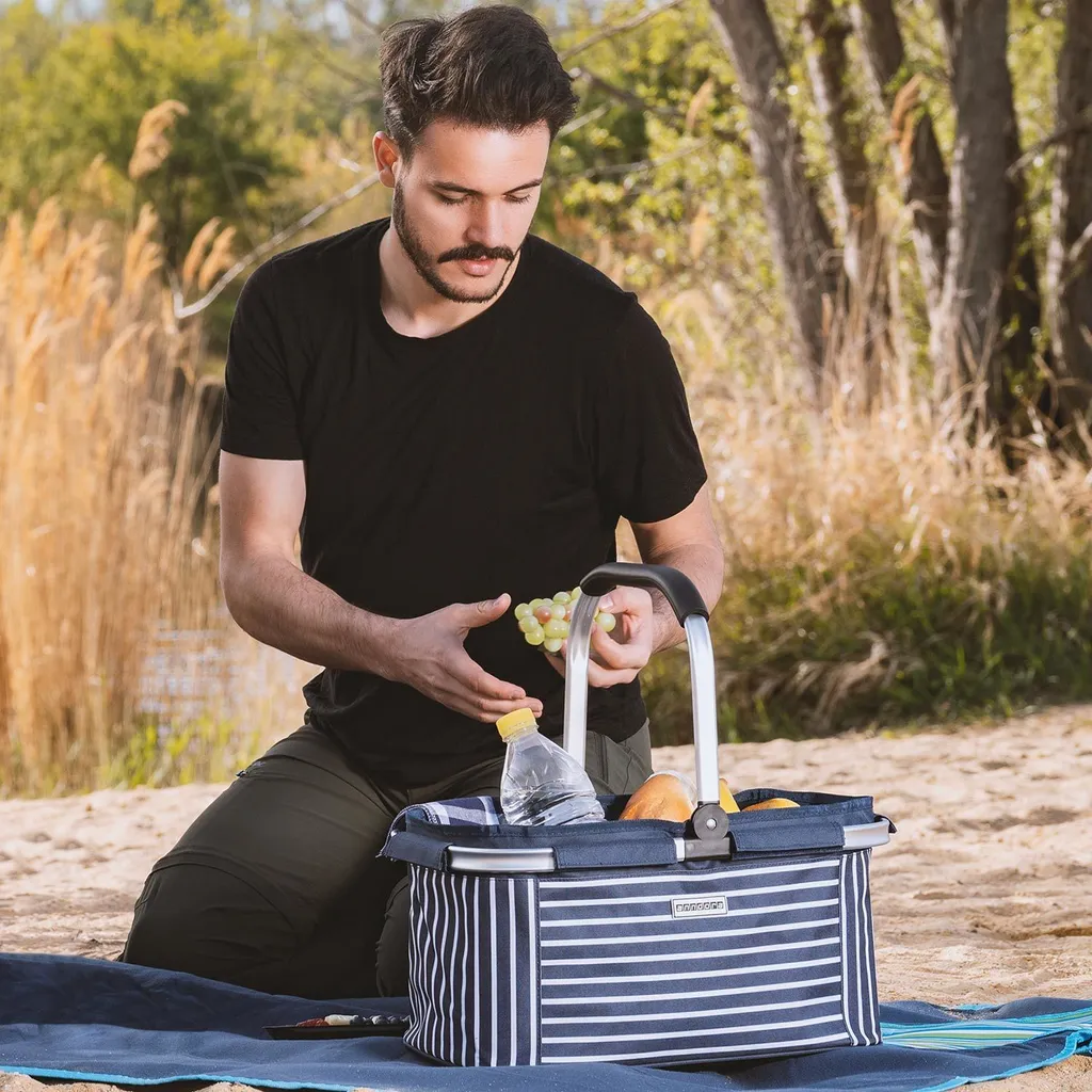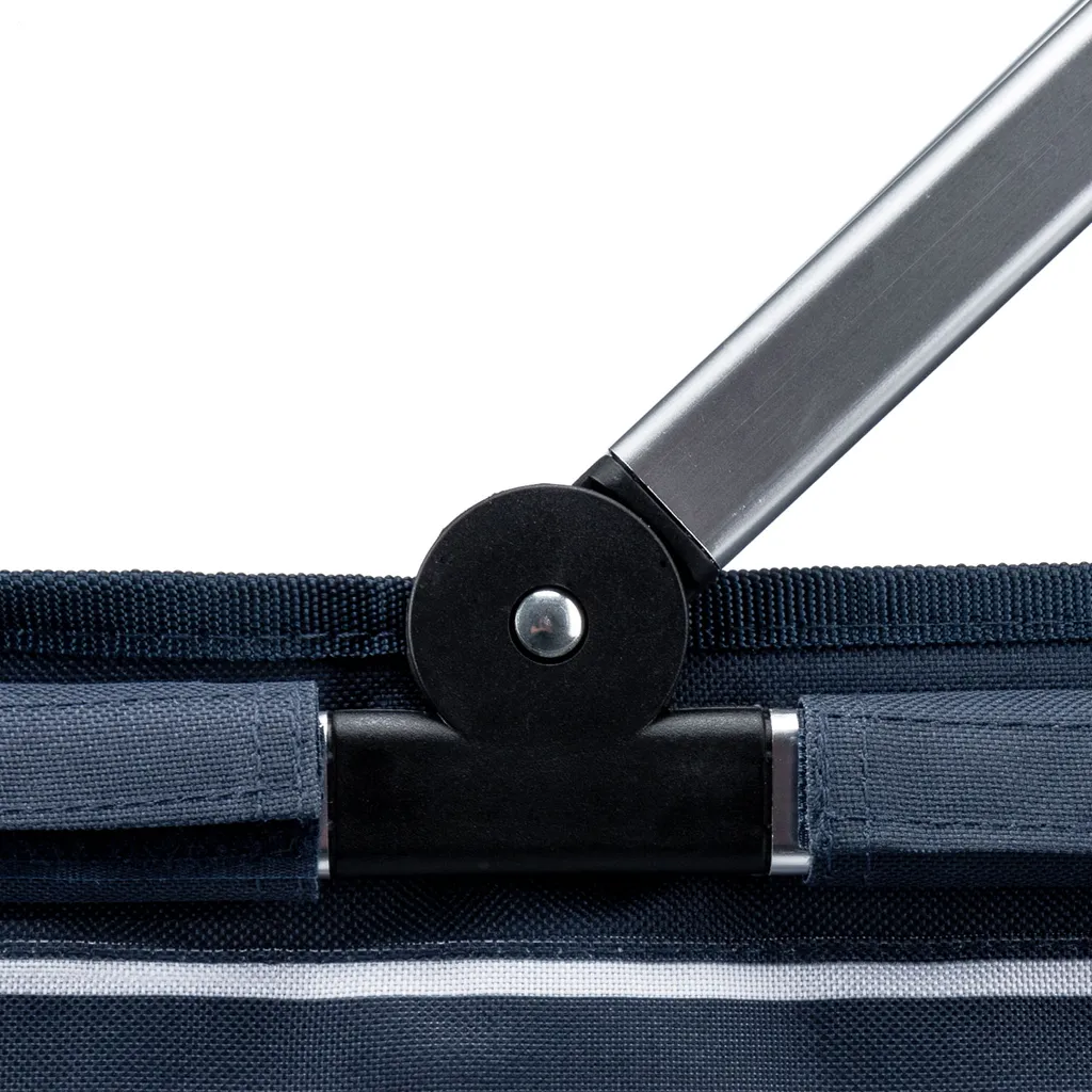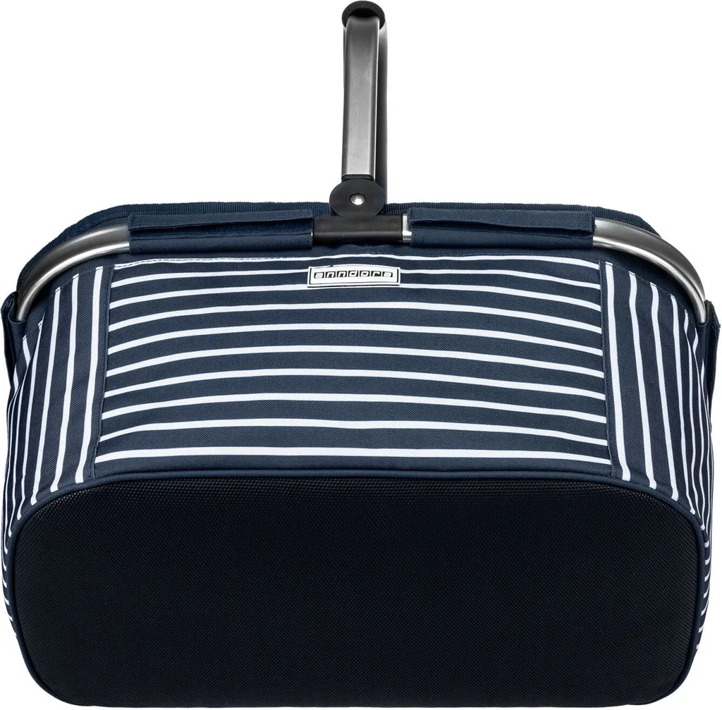 Viel Stauraum bietet dieser Einkaufskorb. Die Verarbeitung mit reißfestem Polyester und Aluminium machen ihn zu einem stilvollen Begleiter bei jedem Einkauf. Zudem ist er federleicht, bevor die Einkäufe darin Platz finden, denn bei einem Volumen von 22 Litern passt einiges hinein. Den Stoff können Sie abnehmen, dazu einfach die Klettverschlüsse an dem Aluminiumgestell lösen. Der solide Polyesterstoff lasst sich per Hand waschen. Der gummierte, genoppte Boden sorgt für einen rutschfesten Stand und lässt sich problemlos abwischen. Der Korbboden ist gepolstert.