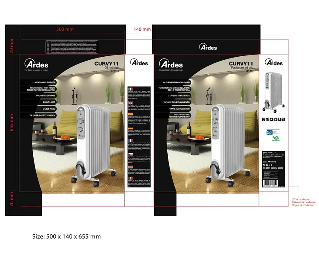 Ölradiator Ardes 4R11S 11 Lamellen Leistung 2500W spezielle thermische Löcher für eine effizientere Heizung Raumthermostat mit Frostschutzfunktion 3 Leistungsstufen 1000W/1500W/2500W praktischer Tragegriff 4 Räder für einen einfachen Standortwechsel komfortabler Griff geeignet für einen Raum von ca. 75 m3 Überhitzungsschutz Leuchtanzeige Raum für die Aufbewahrung des Stromkabels wartungsfreier Betrieb (keine Notwendigkeit, das Öl im Heizkörper zu wechseln) hohe Speicherkapazität. heizt lange nach dem Ausschalten des Stroms völlig geräuschlos ideal für Schlaf- und Kinderzimmer Schutzart IPX0 Abmessungen (HxBxT): 62,5x48x24 cm Gewicht 10,4 kg