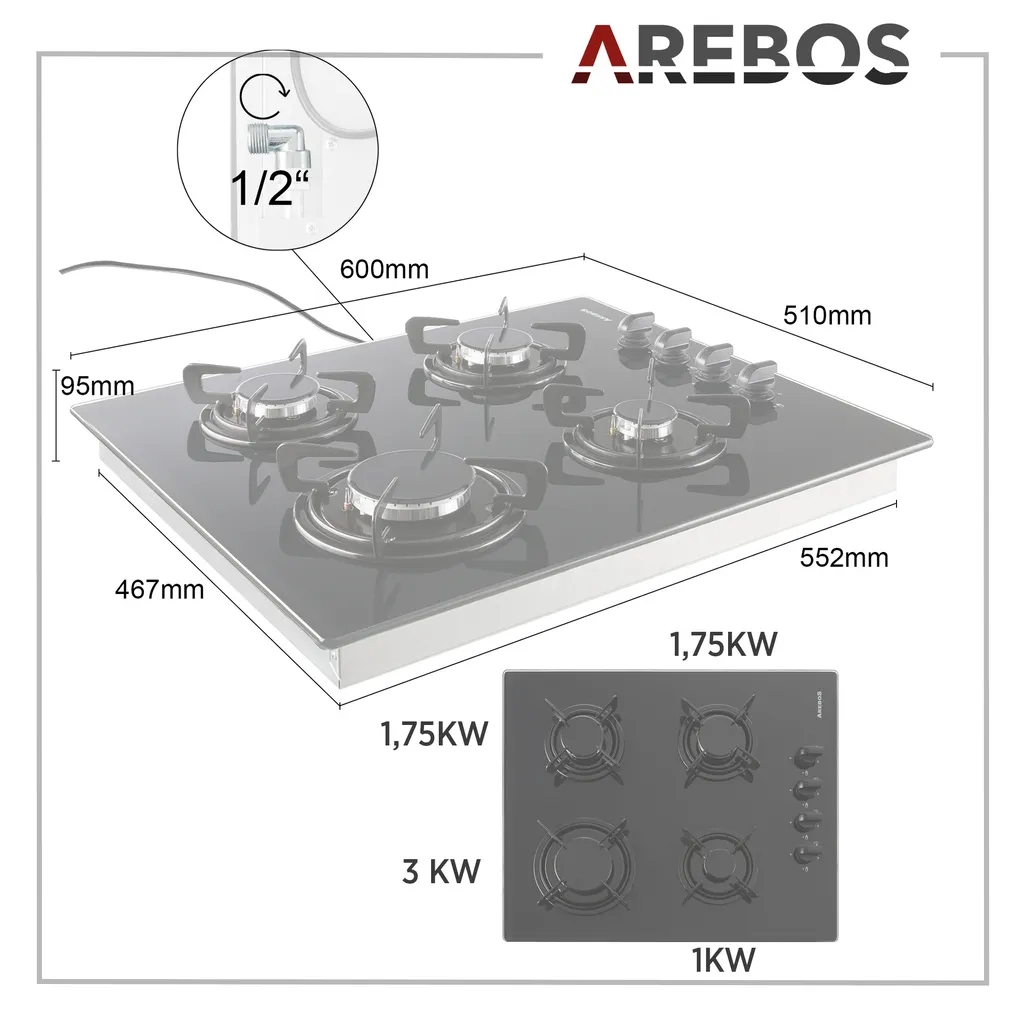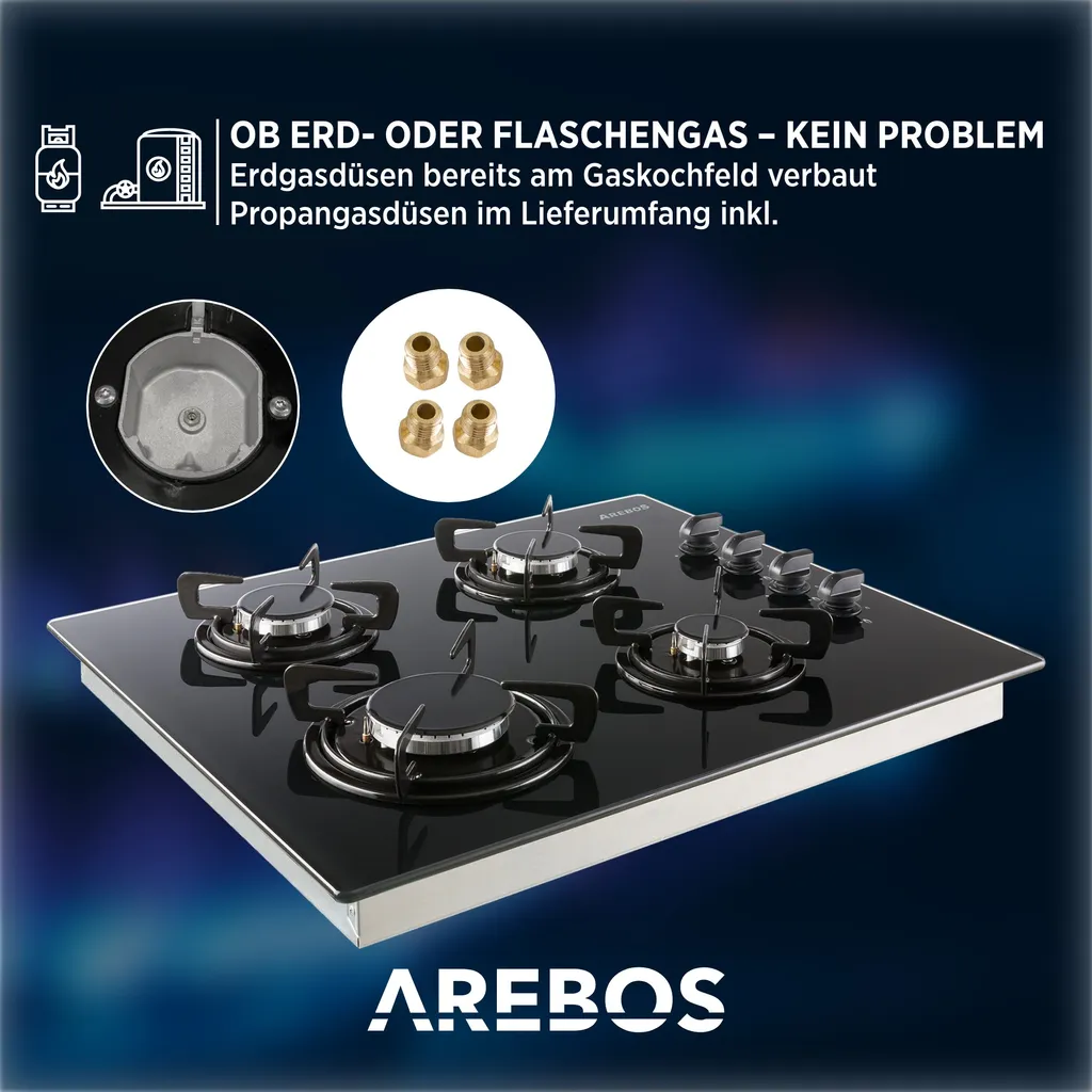 Der Arebos Gasherd zeichnet sich durch das moderne Design und die schöne Verarbeitung aus. Er ist ausschließlich für die Nutzung mit Erdgas geeignet. Außerdem kann man ihn unabhängig von einem Backofen einbauen.