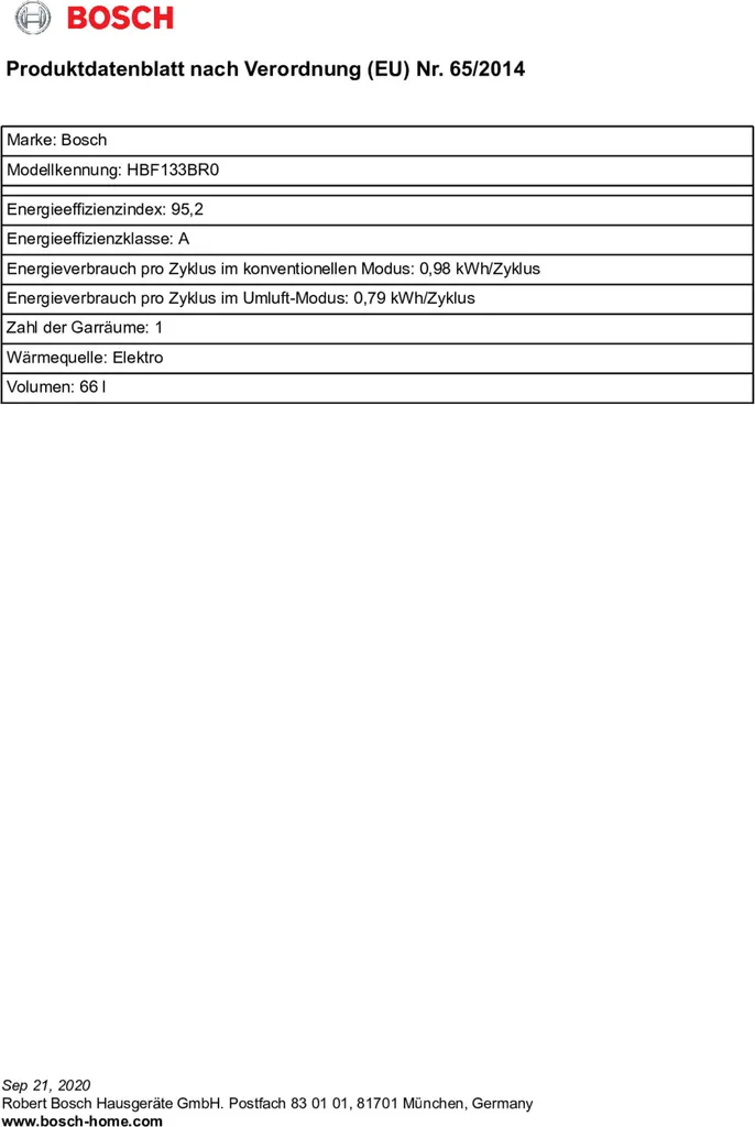 Energieeffizienzklasse (gem. EU Nr. 65/2014): A (auf einer Energieeffizienzklassen-Skala von A+++ bis D) Energieverbrauch pro Zyklus im konventionellen Modus: 0.98 kWh Energieverbrauch pro Zyklus im Umluft-Modus: 0.79 kWh Zahl der Garräume: 1 Wärmequelle: elektrisch Innenraumvolumen: 66 l