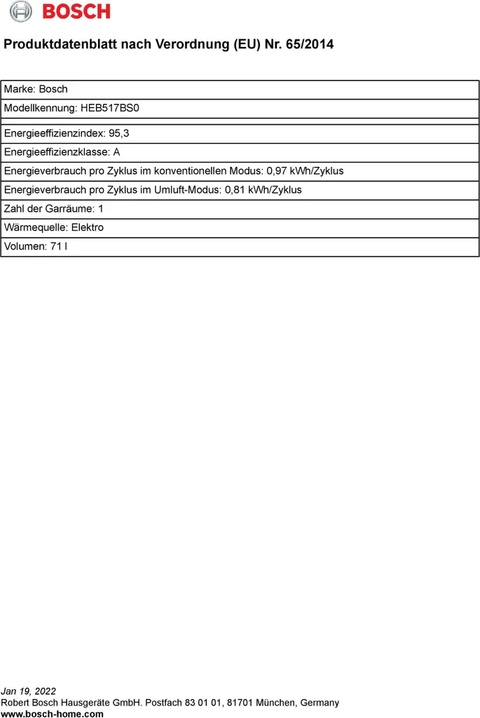 Bosch Serie 6 HEB517BS0 – Backofen – eingebaut – Nische – – Breite: 56 cm – Tiefe: 55 cm – Höhe: 59.5 cm – Klasse A – rostfreier Edelstahl