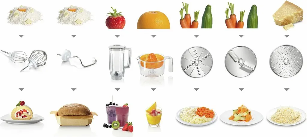 Viele Einsatzmöglichkeiten dank Gebäckset, Gemüseschneider, Mixer, Zitruspresse und einer extra Schüssel aus Kunststoff.