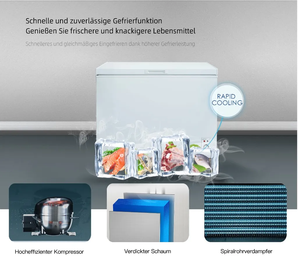Die CHiQ Gefriertruhe FCF197D, mit stufenlos einstellbarem Thermostat verfügt zur einfachen Positionierung über leichtgängige Lenkrollen. Zur wandnahen und damit platzsparender Aufstellung wurden extra dünne Scharniere (nur noch 16 mm !) verbaut, welche mit Einzugsdämpfung ein bequemes Öffnen als auch sicheres Schliessen der Klappe in einem Winkel von 45 – 75 Grad für einen bequemen Zugriff in das Staufach ermöglicht. Der hocheffiziente Kompressor friert dabei bis zu 9 Kg Ihrer frischen Lebensmittel und Gefriertgut innerhalb von 24 Stunden sicher ein.
