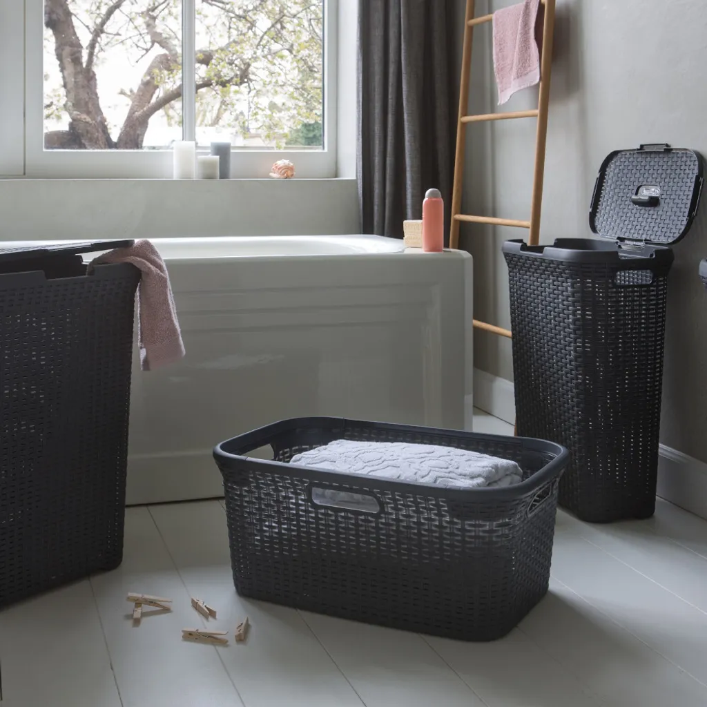 Die Wäschebox My Style von Curver in der Farbe Anthrazit hat ein Fassungsvolumen von ca. 60 l und sorgt dank der offenen Rattan-Struktur für eine gute Luftzirkulation. Mit Hilfe der im Lieferumfang befindlichen Scharniere kann der Deckel schnell und einfach an der gewünschten Position befestigt werden. Er kann wahlweise längsseitig oder an der schmalen Seite angebracht werden. Die rutschhemmenden Füße der Wäschebox sorgen für einen festen Stand.