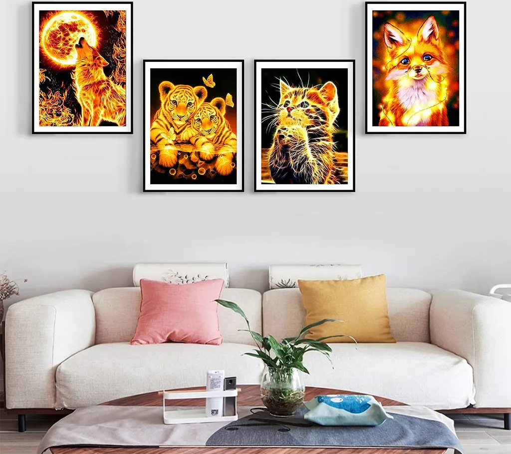 1. 4 Sets 5D-Diamantbilder (30*40cm), 4 wasserfeste Sprühleinwände, genügend 3D-Harzdiamanten, einschließlich 6x klebriger Diamantstifte (4 verschiedene Typen), 1×12 Rasterdiamant-Sortierbox, 8x Folie, 4x grüne Plastiktabletten, 1x Pinzette, 20x Minibeutel