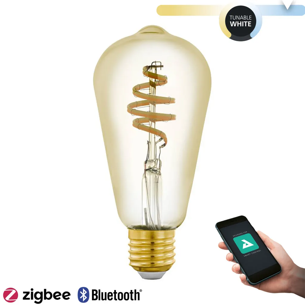 Farbe: amber, Material: Glas, EEK-Klasse: G, Fasssung: E27, Breite: 51-100mm, Durchmesser: 64mm, Leistung: 1x 4,9W, Lichtfarbe: TUNEABLE WHITE, Lumen: 400lm, Leuchtmittel incl: JA, Zusatzinfos: Dimmer inkl.,ZigBee,App Steuerung,Connect System,Bluetooth, Produktart: EGLO Connect Smart Home, E27 LED Lampe, ST64 Leuchtmittel
