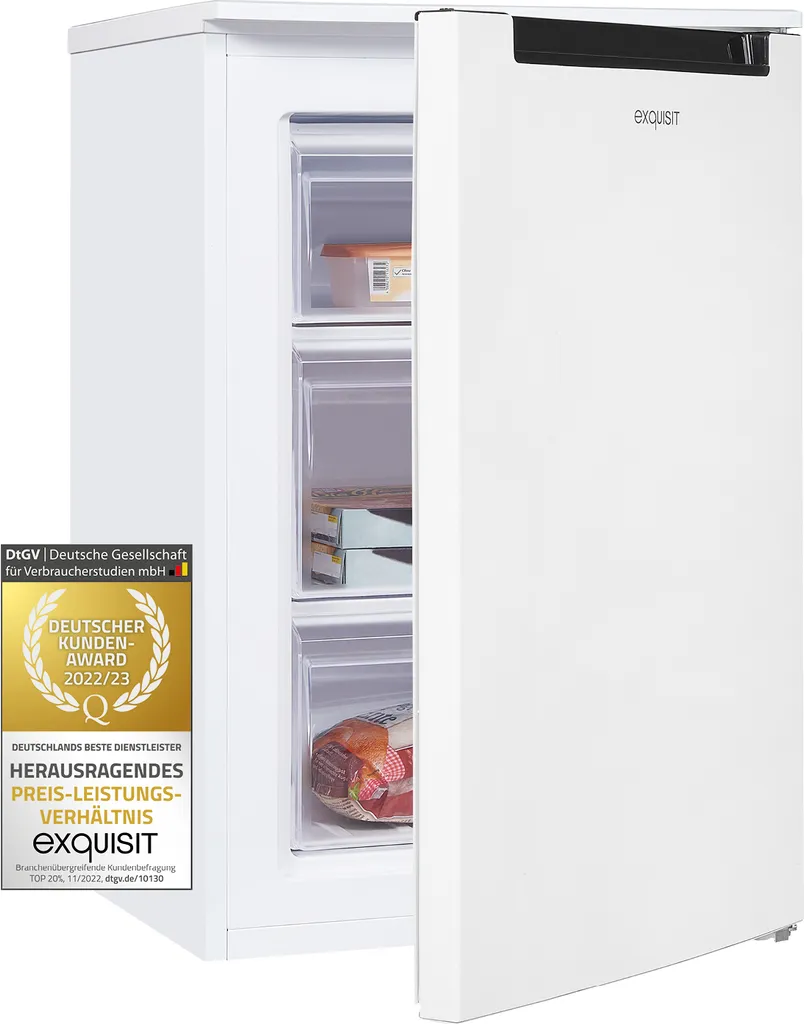 Der Gefrierschrank bietet reichlich Platz für sorgenfreies Lagern über einen längeren Zeitraum. Insgesamt stehen Ihnen 87 l Nutzinhalt zur Verfügung. Das Gerät in der Farbe Weiß hat die Abmaße 85,0 x 55,0 x 58,0 cm (Höhe/Breite/Tiefe) und hat die Energieeffizienzklasse D (Skala Energieeffizienzklasse A bis G). Durch seine freistehende Bauart lässt es sich an jedem Ort aufstellen und in Betrieb genommen werden. Der wechselbare Türanschlag sorgt hierbei für noch mehr Flexibilität beim Aufstellen. Der 4*-Gefrierbereich verfügt über eine Kapazität von 87,0 l und bietet den idealen Ort für Eis, Tiefkühlpizza und alles andere.