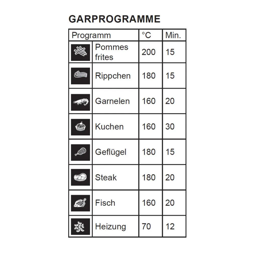 Manuelle Temperatureinstellung: zwischen 80 °C – 200 °C (zum Warmhalten, Grillen, Backen, Braten, Dörren und Auftauen)