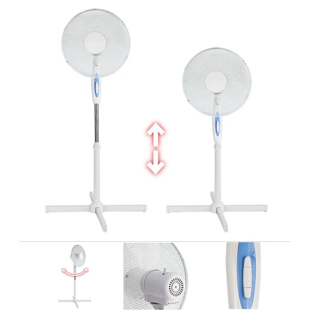 Mit drei einstellbaren Geschwindigkeitsstufen (langsam/mittel/schnell) und verstellbarem Neigungswinkel sowie zuschaltbarer Oszillation können Sie den Ventilator Ihren Bedürfnissen individuell anpassen. Das Gerät sorgt mit einem leistungsstarken 45 Watt Motor mit einem ca. 41 cm Durchmesser und einer Gesamthöhe von 121 cm für ausreichend Frischluft im Raum. Eine sinnvolle Zusatzfunktion ist die zuschaltbare Oszillationsfunktion. Diese ermöglicht, dass das Gehäuse des Ventilators sich um etwa 80° nach rechts und links bewegen kann.