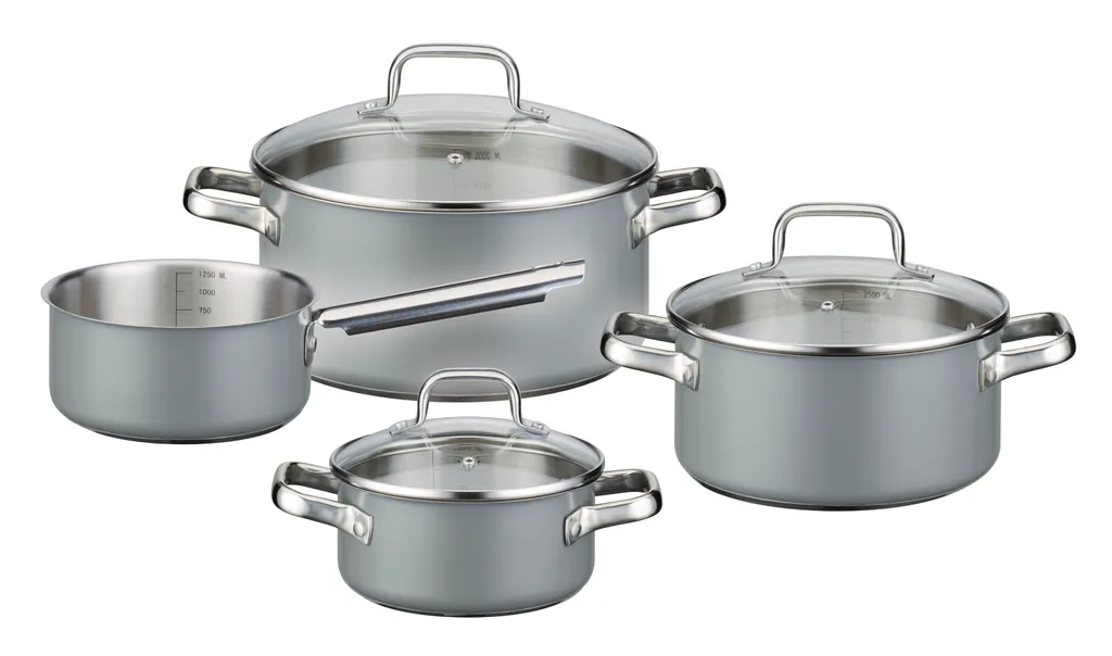 Beschreibung: Das Kochtopf-Set ist aus hochwertigem Edelstahl rostfrei 18/8 gefertigt und besticht durch eine trendige Außenfarbe. Die vorhandene Literskala in den Töpfen, der energiesparende Kapselboden und die handfreundlichen Kaltmetallgriffe sorgen für einen großen Spaß beim Kochen. Die Töpfe sind für alle Herdarten – auch für Induktion geeignet.