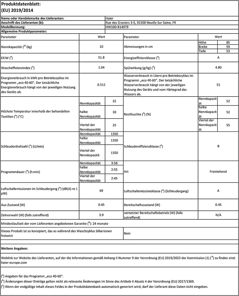 Haier HW100-B14979 Waschmaschine Frontlader 10 kg 1.351 U/Min 14 Programme (Skala A bis G)