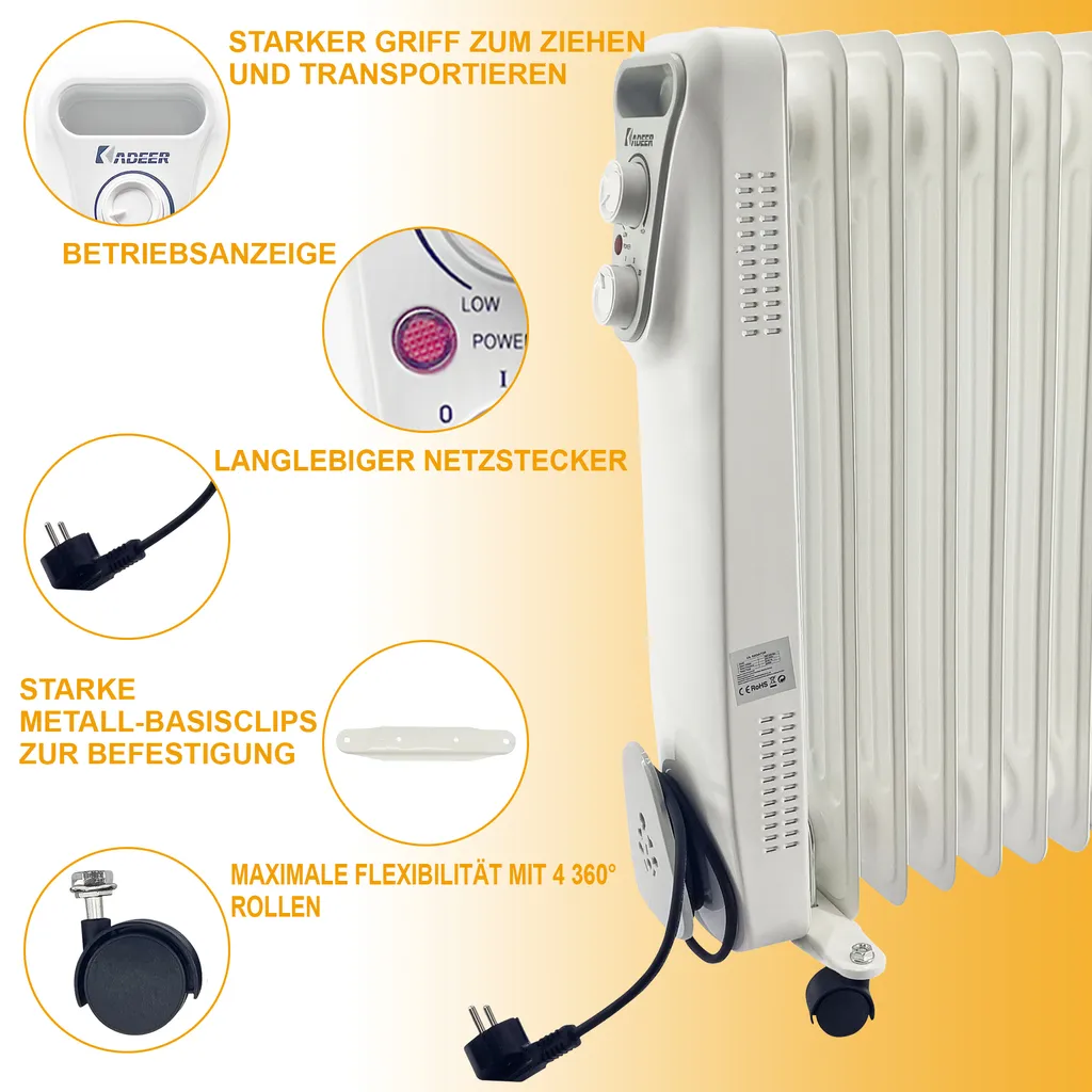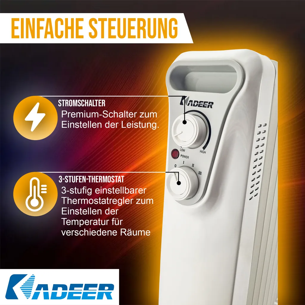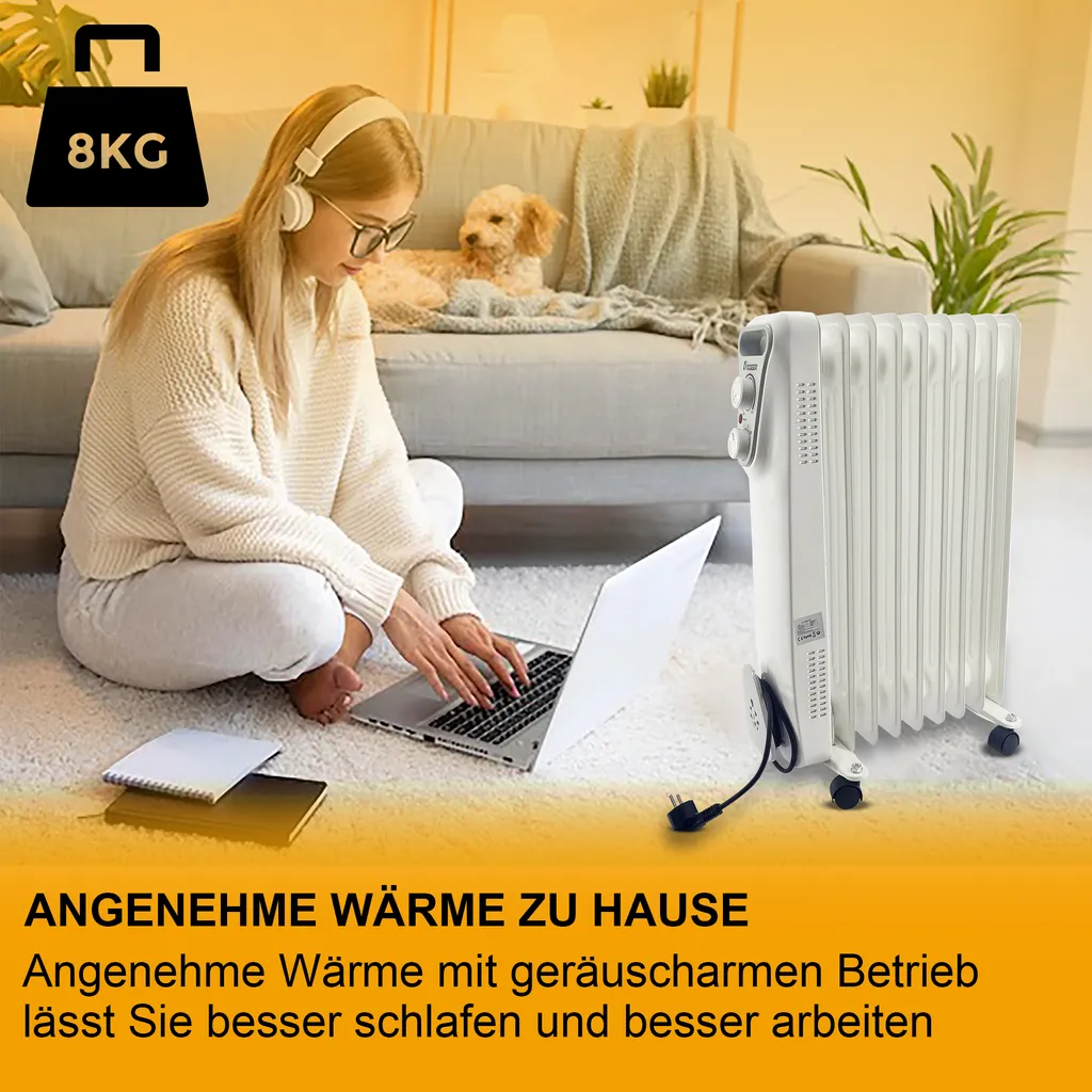 - WOHLIGE WÄRME ZUHAUSE: Unsere Elektrische Heizung mit 9 ölgefüllten Heizlamellen schafft schnell eine warme Atmosphäre in Ihrem Zuhause, 3 Heizstufen & Thermostat um die Temperatur für verschiedene Räume anzupassen, ideal zum effektiven und andauernden Heizen von Schlafzimmer, Büro, Garage und Bad.