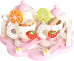 Teeservice ermöglicht es Ihnen, allein oder mit Freunden Spaß zu haben. Das Kind kann Tee für die Puppe, den Teddybären oder für Geschwister und Eltern kochen.