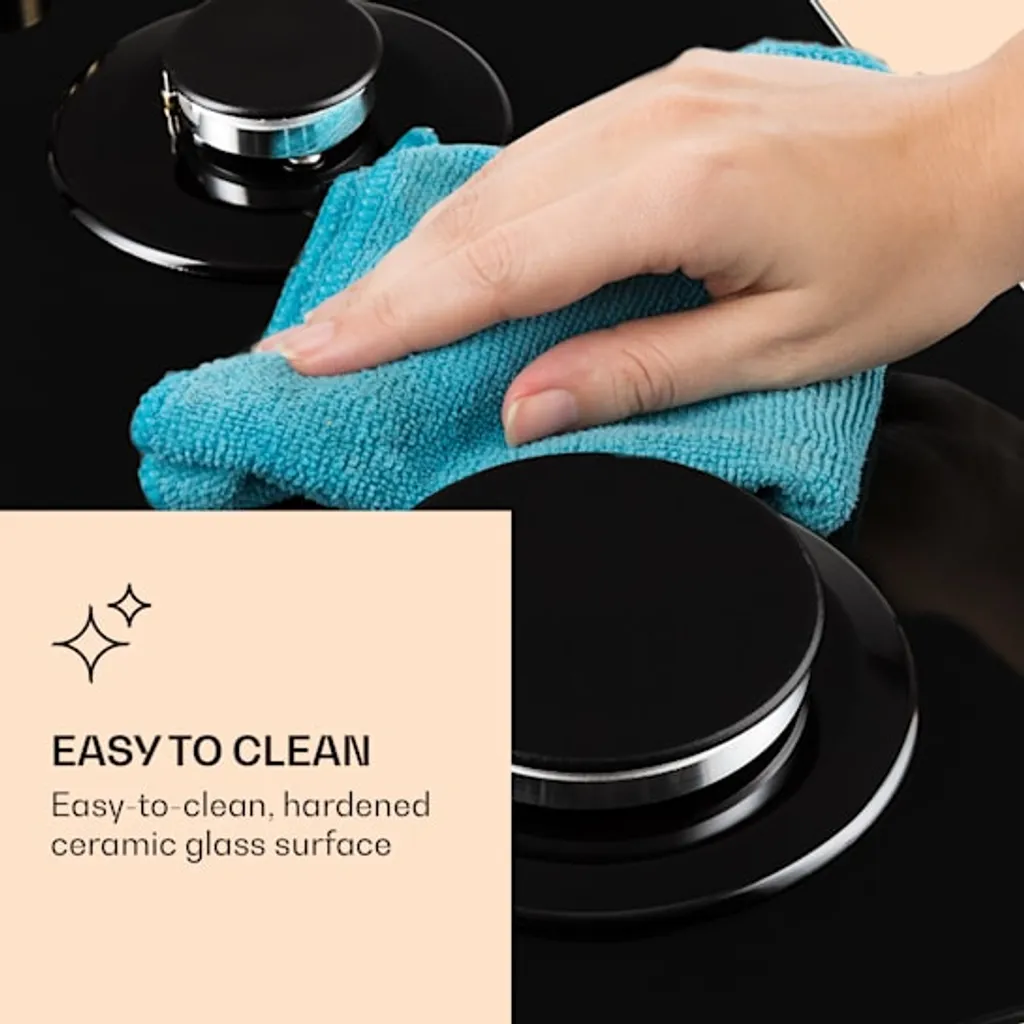 Auf dem platzsparenden Klarstein Victoria Domino Gaskochfeld befinden sich zwei hochwertige Sabaf-Brenner, die mit einer Leistung von 3 kW und 1 kW ordentlich einheizen. Die Brenner verteilen die Hitze gleichmäßig in der Mitte und an den Rändern deines Kochgeschirrs, so wird alles perfekt gegart. Die Bedienung ist dank der selbsterklärenden Symbole an den großen im Retro-Design gestalteten Drehknöpfen absolut intuitiv, die Hitzezufuhr kann während des Kochvorgangs immer wieder direkt angepasst werden. Via SnapJetIgnition entzündest du die Flamme, somit ist kein zusätzliches Feuer nötig. Das abnehmbare Kreuz aus massivem Gusseisen sitzt passgenau und kippsicher über den Flammen. Das Kochfeld ist mit einer gehärteten, pflegeleichten Keramikglas-Beschichtung versehen, die nicht nur gut aussieht, sondern auch besonders leicht zu reinigen ist.