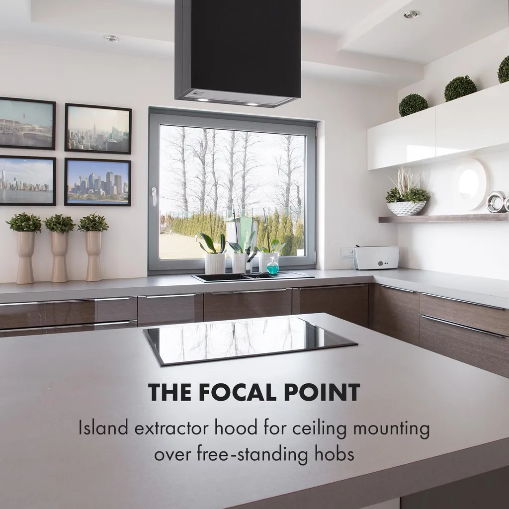 – Der Fokuspunkt: Inselabzugshaube zur Deckenmontage über freistehenden Kochstellen