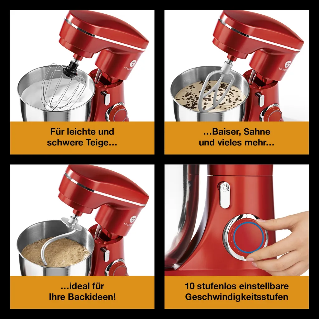 Die Kochwerk Küchenmaschine ist dank des integrierten 1300 Watt Kupfermotors Ihr leistungsstarker und langlebiger Begleiter in der Küche. Egal, ob für Kuchen- und Keksteige, Sahne, Baiser oder sogar schwere Teige – mit den 10 verschiedenen Geschwindigkeitsstufen und dem planetarischen Rührsystem werden die Ergebnisse gleichmäßig und geschmeidig.