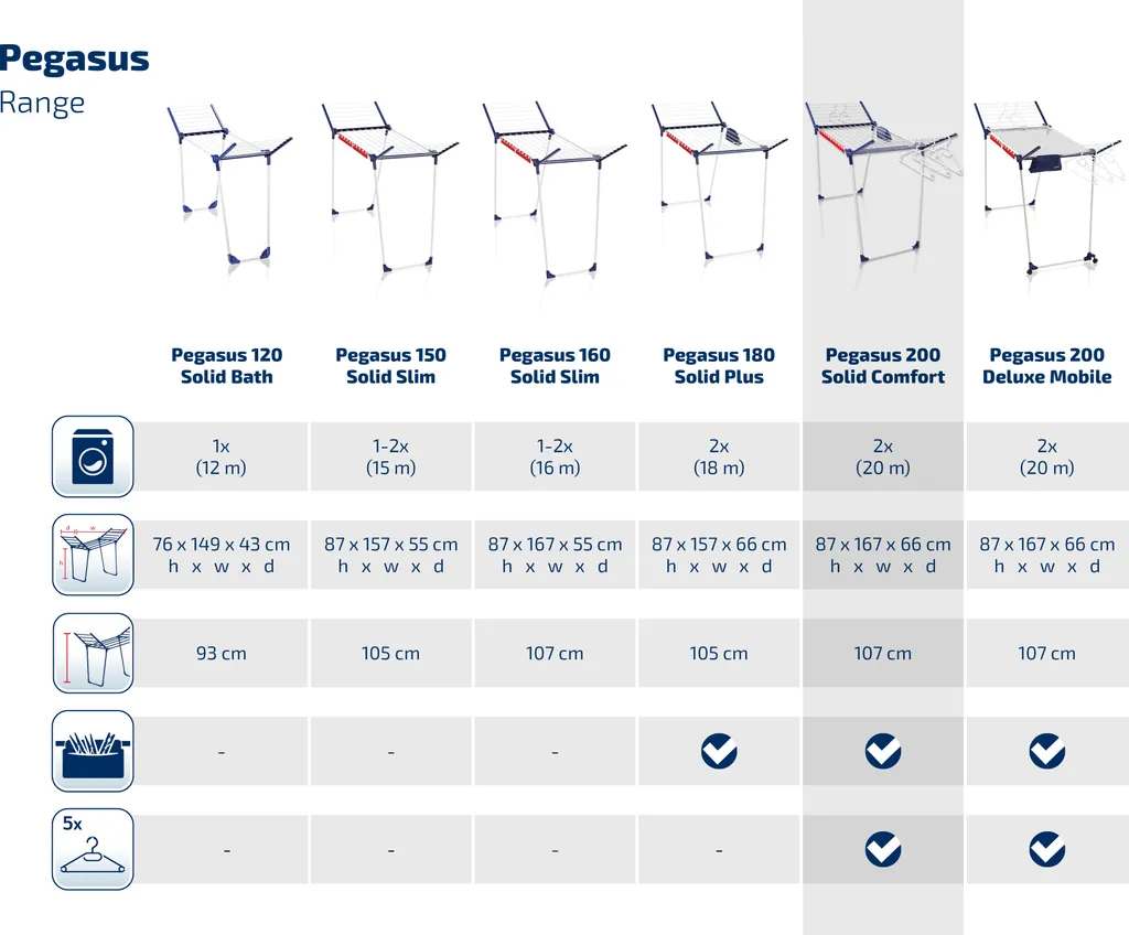 | Zusätzliche Varianten | Standtrockner Pegasus 200 Solid Comfort, Standtrockner Pegasus 200 Solid Deluxe Mobile |