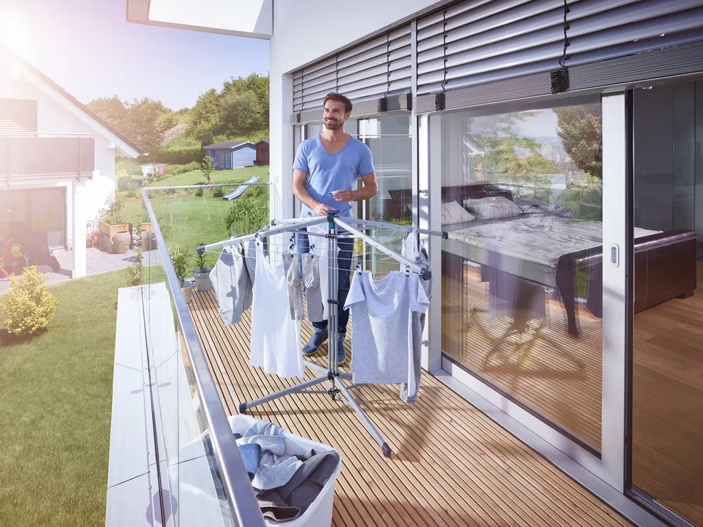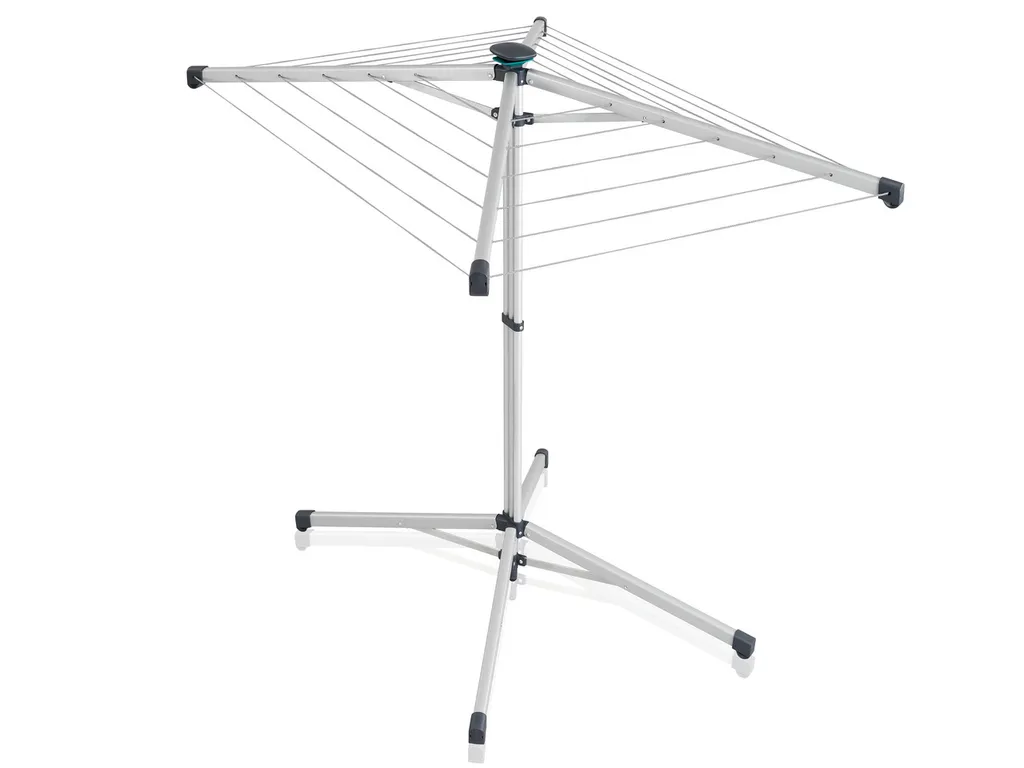 Die Leinen sind von innen nach außen leicht abfallend angeordnet, sodass man problemlos jede Leine erreicht. Mit einer Höhe von 95 cm bietet selbst die äußerste Leine die Möglichkeit lange Wäschestücke wie beispielsweise Badehandtücher oder Hosen zu trocknen. Dabei sorgen die stabilen Leinenarme und die breite Aufstellfläche, auch voll beladen, für einen sicheren Stand. Durch Druck auf den Bediengriff lassen sich die Leinen einfach und bequem nachspannen.