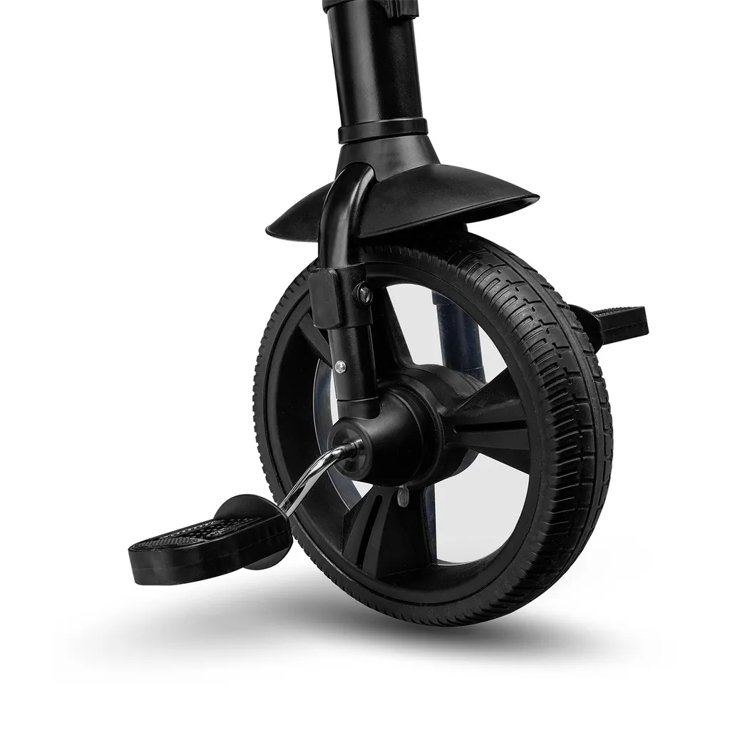 Drei Räder mit großem Durchmesser (10“ und 8“) und einer speziell entwickelten Profil erleichtern das Fahren auf holprigen Straßen. Die Räder sind vollständig aus hochwertigem, sehr leichtem PolyurethanMaterial hergestellt – dadurch ist es nicht möglich, sie zu durchstechen und müssen nicht gepumpt werden. Am Vorderrad befindet sich auch eine Abdeckung, die die Füße des Babys schützt und auch als Kotflügel dient.