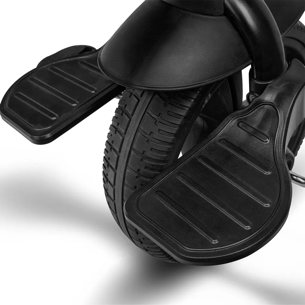 Dreirad mit Vorder- oder Rücksitz. Das eingeklappte Verdeck und die Fußstütze für Kleinkinder bieten Komfort für Kinder, während die Gurte und der Sicherheitsbügel für die Sicherheit sorgen.