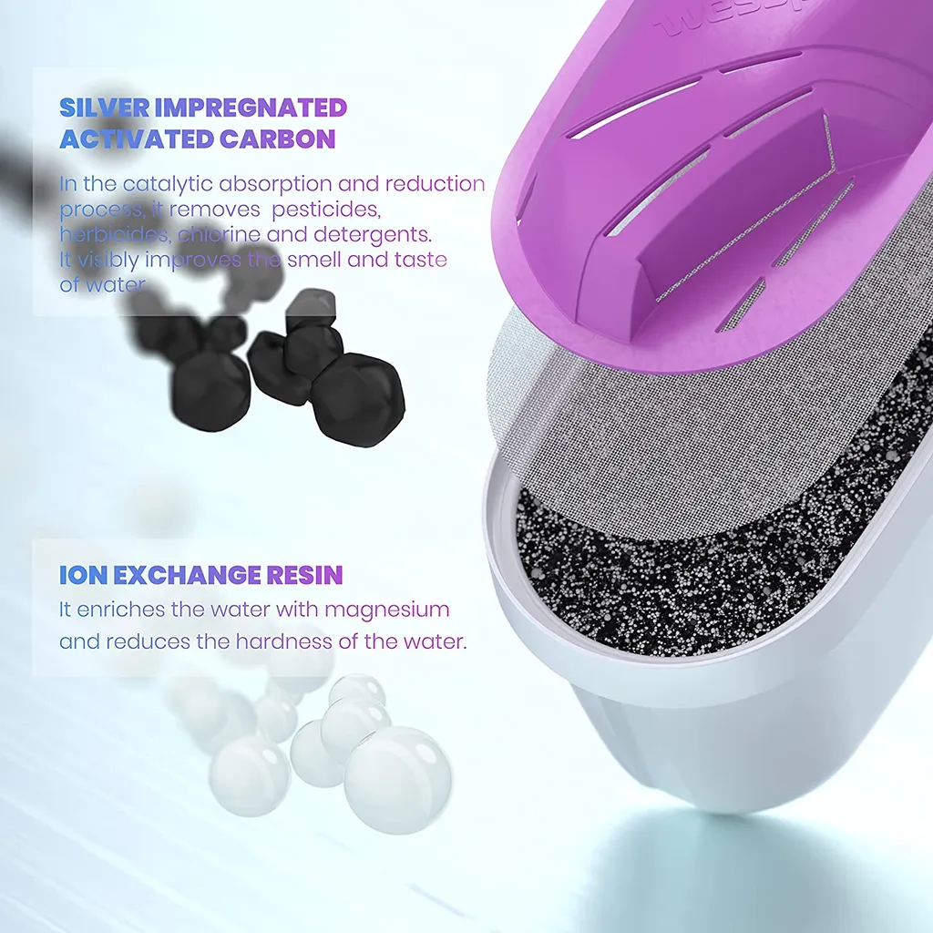 - Der Wessper AquaMax MG+ Filter hat eine effektiv ausgewählte Filtermischung, die aus silberimprägnierter Aktivkohle und Ionenaustauschharz besteht.