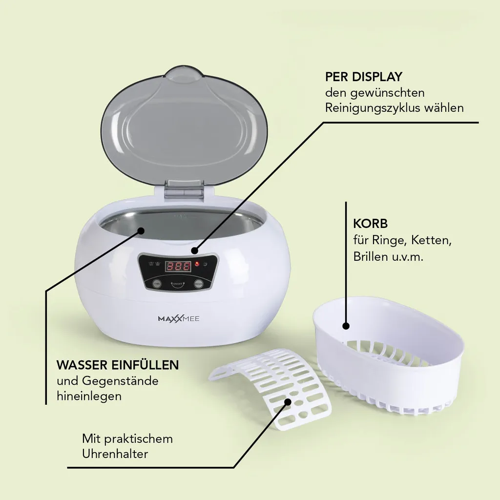 Mit dem MAXXMEE Ultraschall-Reinigungsgerät kannst du Gegenstände verschiedenster Art einfach in wenigen Minuten reinigen – nur mit Leitungswasser. Das Ultraschall-Reinigungsgerät kann für Schmuck, Glas, Brillen, Armband, Münzen, Geschirr, Laborinstrumente, aber auch für Zahnspangen, Zahnersatz u.v.m. verwendet werden. Wähle einfach per Display den entsprechenden Reinigungszyklus aus, lege die Artikel in den Tank – und auf Knopfdruck kannst du die Reinigung starten.