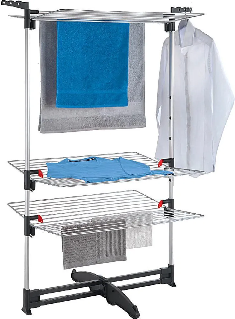 Neue verbesserte Version des Klassikers! Mit höhenverstellbaren Epotherm-beschichteten Gittern (rostbeständig und langlebig) und Seitenteilen aus Aluminium. Inklusive 2 Kleiderbügelhaltern. Füße zusammenklappbar. 3 Etagen, Trockenlänge: 40 Meter
