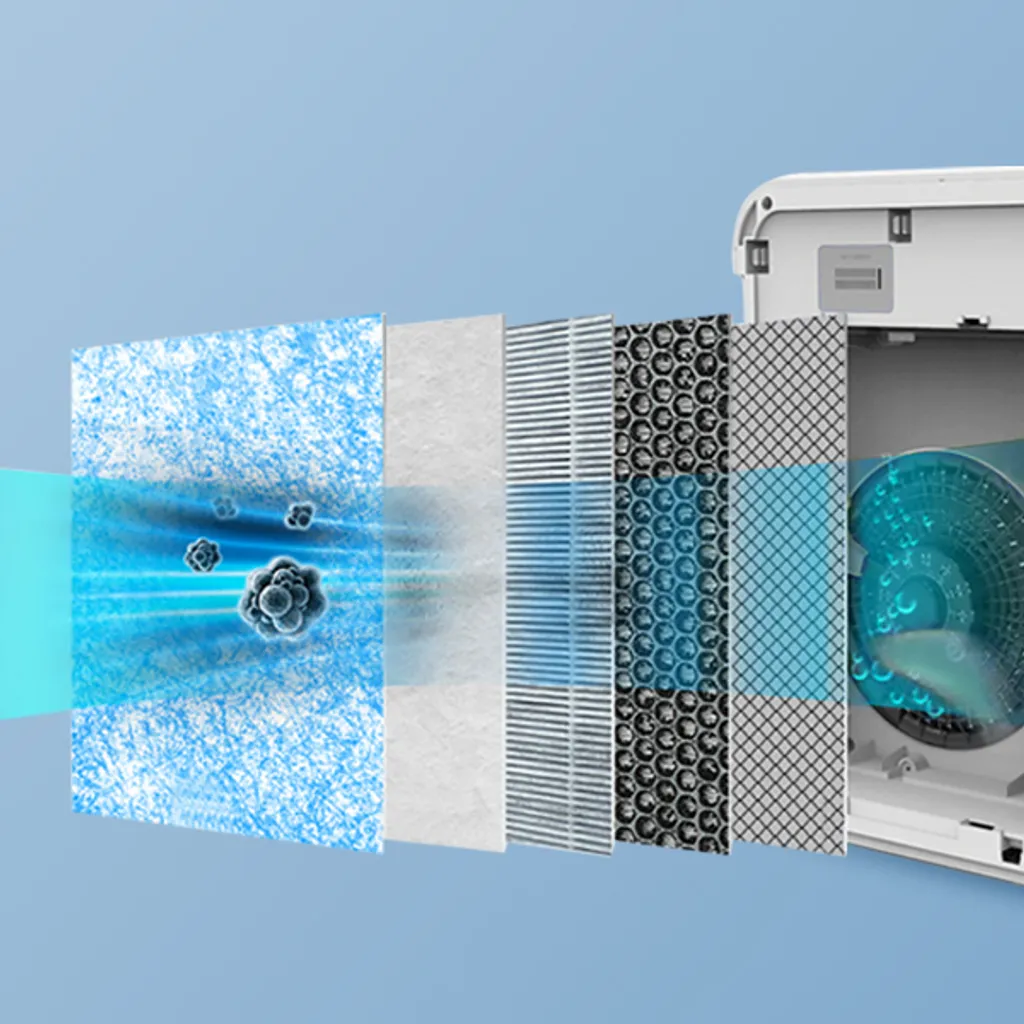 Die 5 stufige Filterung des Midea Luftreinigers besteht aus Vorfilter, HEPA-Filter, Aktivkohlefilter und 2 Kältekatalysator.