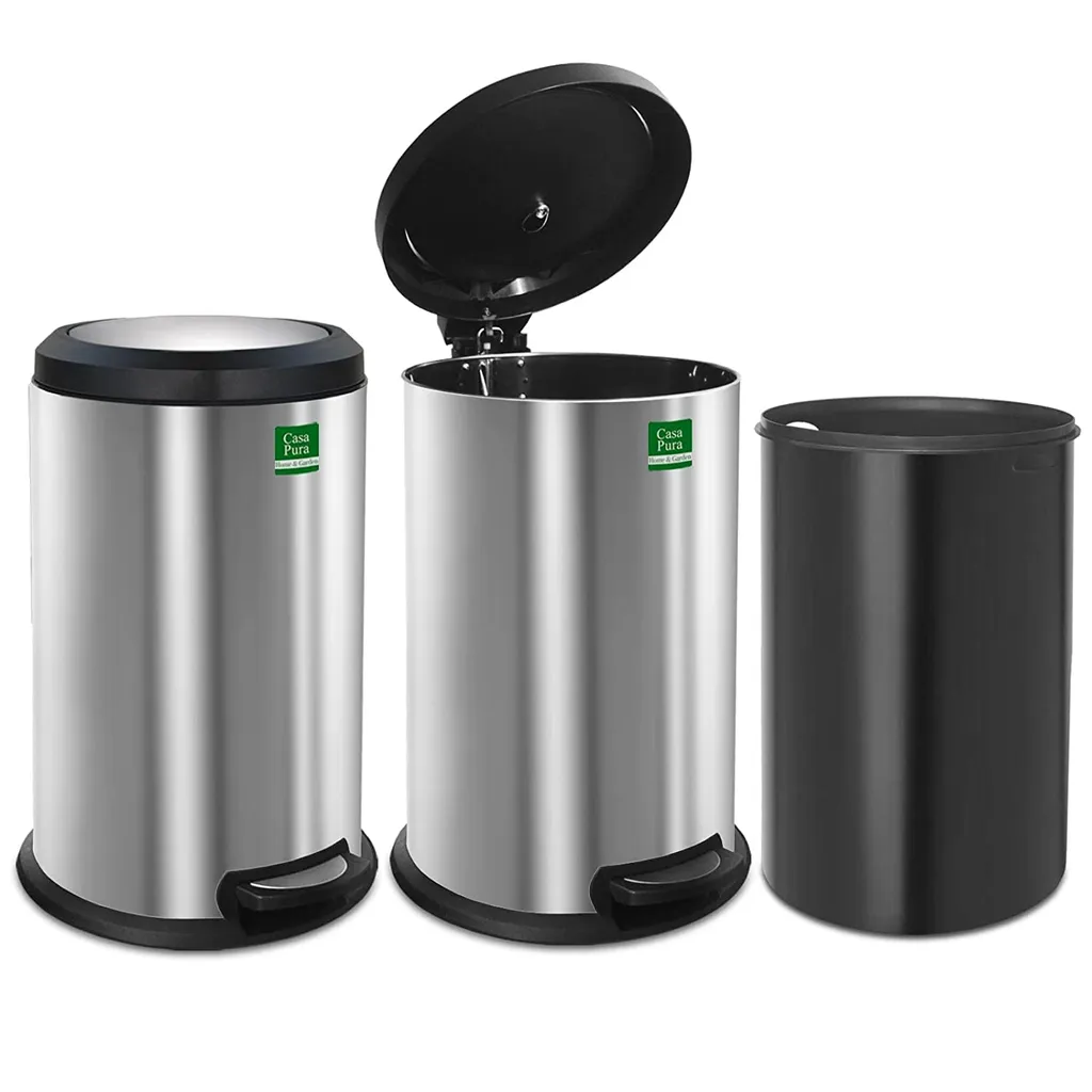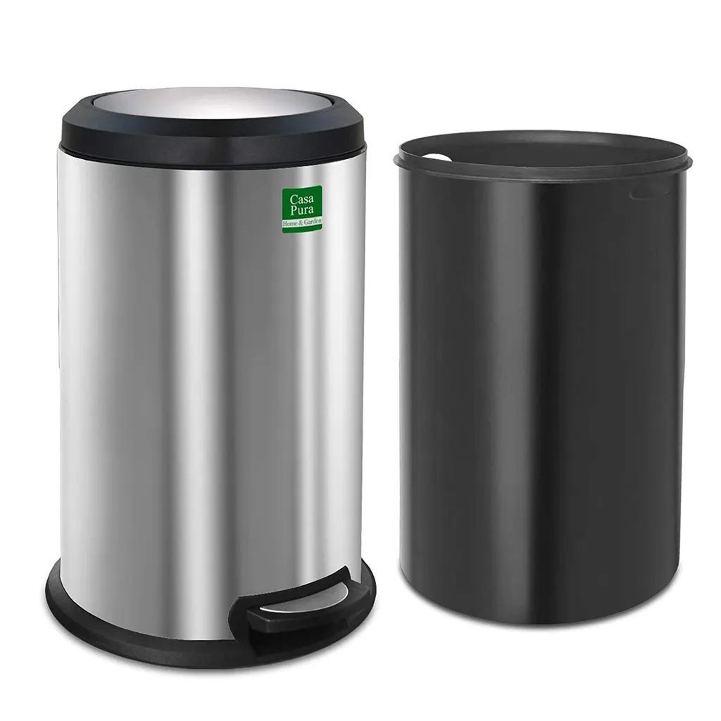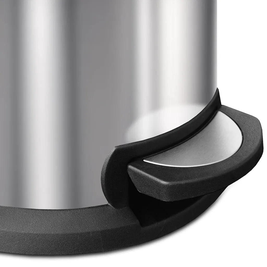 Das Gehäuse des Abfalleimers besteht zum größten Teil aus robustem, rostfreiem Edelstahl. Einzelne Elemente sind aus stabilem Kunststoff gefertigt. Der herausnehmbare Abfallbehälter besitzt an den Seiten zwei ausgesparte Griffe und kann kinderleicht entnommen und wieder eingesetzt werden. Zum Öffnen wird einfach das Pedal an der unteren Seite des Pedal-Mülleimers mit dem Fuß betätigt. Der Deckel besitzt einen integrierten und verstellbaren Schließmechanismus, welcher die Geschwindigkeit des Schließvorgangs reguliert. Das Schließen des Deckels erfolgt dabei automatisch und angenehm leise.