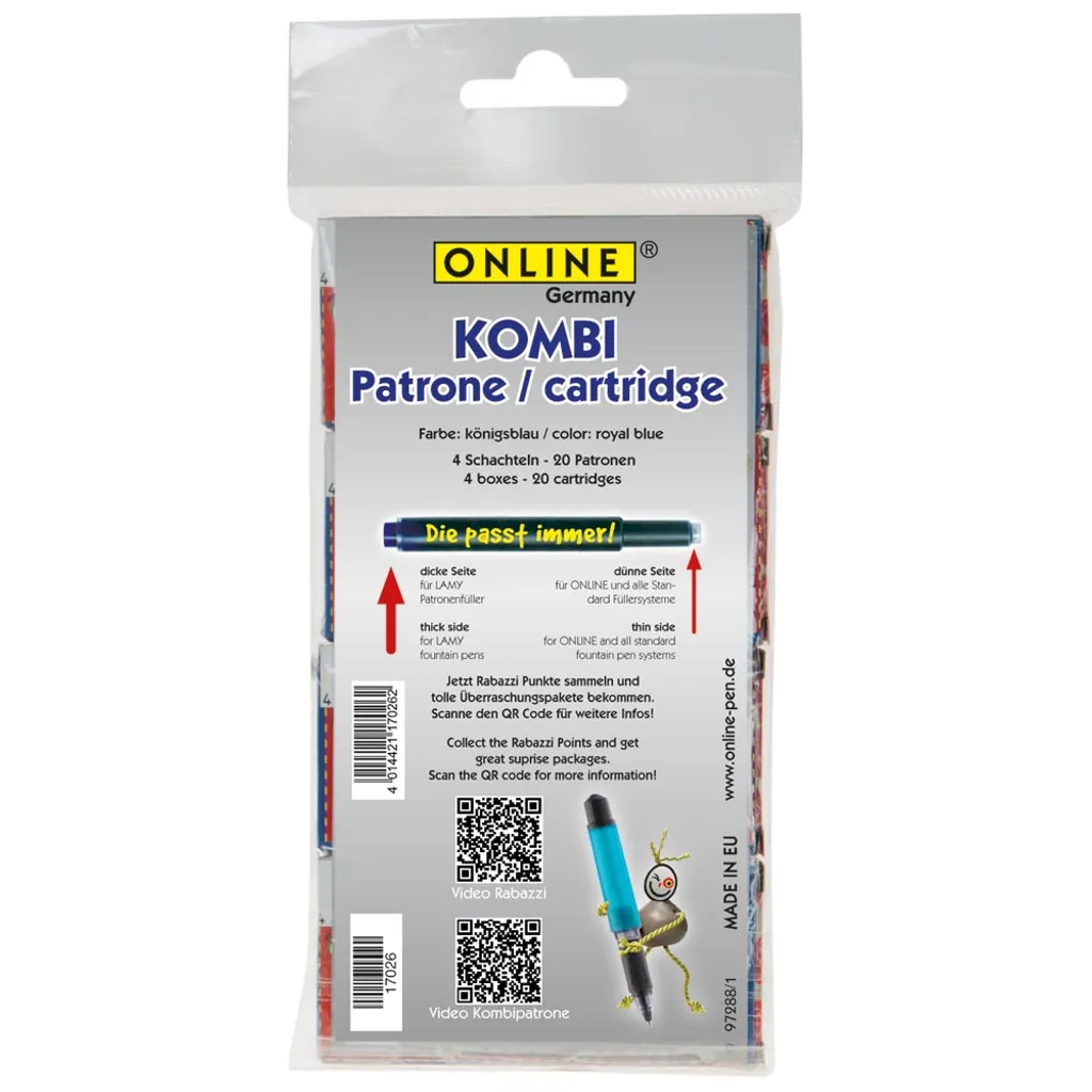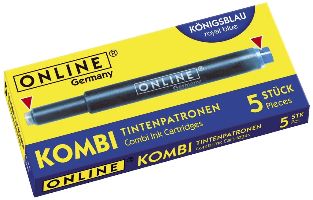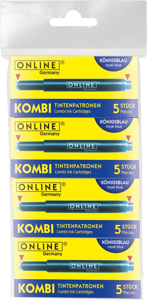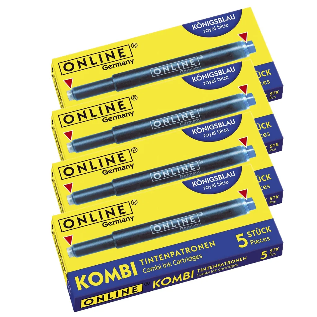 ONLINE Kombi Füllhalter-Tintenpatronen, königsblau, dünne Seite für alle ONLINE und Standard Füllhalter, dicke Seite für Lamy Füllhalter, löschbar und auswaschbar, Inhalt: 5 Stück