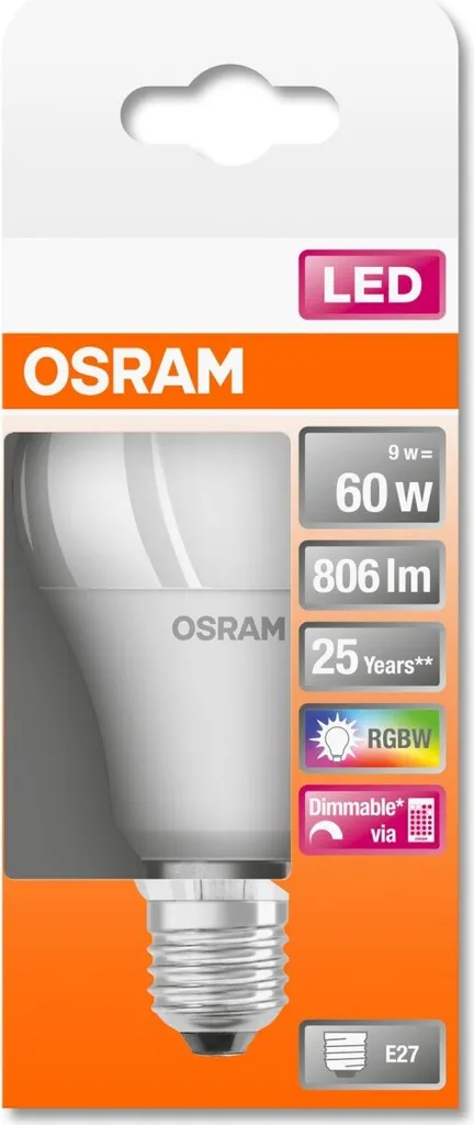 Lieferumfang: 1 x Osram LED Lampe mit Fernbedienung RGBW dimmbar E27 warmweiß 2700K 9W Farbwechsel – Artikel wie abgebildet