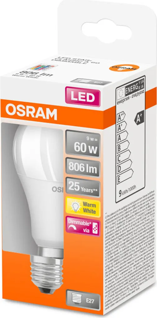 Die LEDs entfalten sofort volle Lichtleistung und entwickeln dabei deutlich weniger Wärme im Vergleich zu herkömmlichen Glühlampen oder Energiesparlampen. Mithilfe der mitgelieferten Fernbedienung lassen sich bequem verschiedene Einstellungen vornehmen, weder das Smartphone noch eine App werden benötigt. Features: – Einfacher Einbau – Individuelle Steuerung – Weder App noch Smartphone zur Steuerung der Lampe nötig – Komfortable und intuitive Infrarot-Fernbedienung – Schalten, Dimmen in 4 Stufen und Farbeinstellung per Knopfdruck – Color Loops für dynamische Farbwechsel Technische Daten: – Energieeffizienzklasse: G – EEK-Spektrum: A – G – Gewichteter Energieverbrauch: 10 kWh/1000 h – Schutzart: IP20 – Leistung: 9,7 W – Entspricht Glühlampe: 60 W – Betriebsspannung: 230 V – Leistungsfaktor: > 0,5 – Lichtstrom: 806 lm – Lichtausbeute: 83 lm/W – Lichtstromerhalt am Ende der Lebenszeit: 70 % – Lichtfarbe: warmweiß – Farbtemperatur: 2700 K – Farbwiedergabeindex (CRI): > 80 Ra – Abstrahlwinkel: 200° – Anlaufzeit bis 60 %: 0,5 s – Zündzeit: < 0,5 s – Temperaturbereich: -20…+40 °C – Mittlere Lebensdauer: 25000 Stunden – Schaltzyklen: 100000 – Sockel: E27 – Quecksilberfrei: ja – Dimmbar: ja – Gesamtmaße (ØxH): 60×108 mm – Gewicht: 33 g