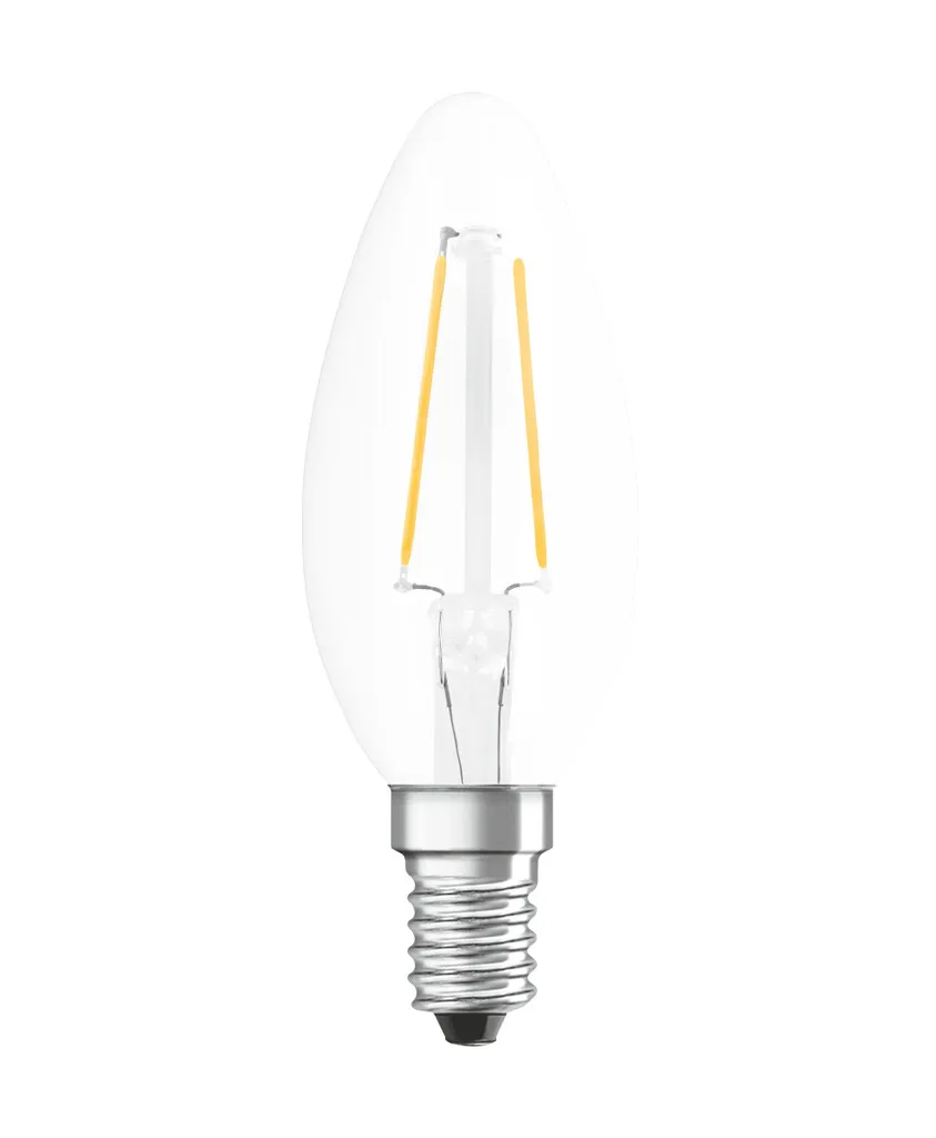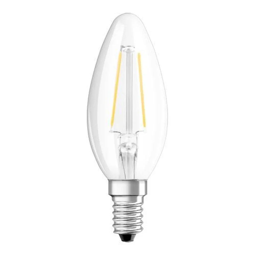 Dimbare LED – Lampen, klassische Kolbform. Produkteigenschaften: LED-Lampen für Netzspannung. Dimmbar (an vielen handelsüblichen Dimmern). Ausstrahlungswinkel: bis zu 300°. Lebensdauer: bis zu 15.000 h. Lampe aus Glas. Gute Lichtqualität, Farbwiedergabeindex Ra: ? 80, konstanter Farbort. Produktvorteile: Lampen mit innovativer LED-Filament-Technologie. Sehr geringer Energieverbrauch. Sofort 100 % Licht, keine Aufwärmzeit. Einfacher Austausch von StandardGlühbirnen. Design, Abmessungen, Lichtstrom vergleichbar mit einer Glühbirne. Anwendungsgebiete: Ideal für dekorative Einbauten. Dekorative Anwendungen. Allgemeinbeleuchtung. Einsatz im Außenbereich nur in geeigneten Außenleuchten.Leuchtmitteltyp: LED FILFassung: E14Leistung: 2,8 WLichtleistung: 250 lmLichtfarbe: 2.700 K (warmweiß)Dimmbar: ja, stufenlosBauart: Kerzenform (B25)Farbe: klarMaterial: GlasMaße: 9,7 x 3,5 cm (L x Ø)Abstrahlwinkel: bis zu 360°Lebensdauer: 15.000 hSchutzart: IP20Entspricht: Glühbirne 25 WTemperaturbereich: -20