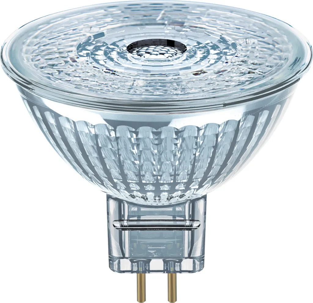 Dimmbare Niedervolt-LED-Reflektorlampen MR16 mit Retrofit-Stecksockel. Produkteigenschaften: LED-Alternative zu konventionellen Niedervoltlampen. Dimmbar (an vielen handelsüblichen Dimmern). Quecksilberfreie Lampen. Produktvorteile: Sehr lange Lebensdauer von bis zu 25.000 h. Geringer Energieverbrauch. Hohe Farbkonsistenz dank engem Binning. Einfacher Ersatz von Halogenlampen durch kompaktes Design in Vollglas und einzelner Linse. Ideal für die wirtschaftliche Spotbeleuchtung. Anwendungsgebiete: Geschäfte. Gastronomie. Museen, Galerien. Wohnräume. Als Downlight zur Markierung von Gängen, Türen, Treppen, etc.. Spotbeleuchtung für Lichtakzente. Vitrinen und Schaufenster. Anstrahlen wärmeempfindlicher Objekte wie Lebensmittel, Pflanzen usw.. Einsatz im Außenbereich nur in geeigneten Außenleuchten.Leuchtmitteltyp: LEDFassung: GU5,3Leistung: 4,9 WLichtleistung: 350 lmLichtfarbe: 2.700 K (warmweiß)Dimmbar: jaBauart: ReflectorFarbe: klarMaterial: GlasMaße: 4,6 x 5,1 cm (L x Ø) Abstrahlwinkel: