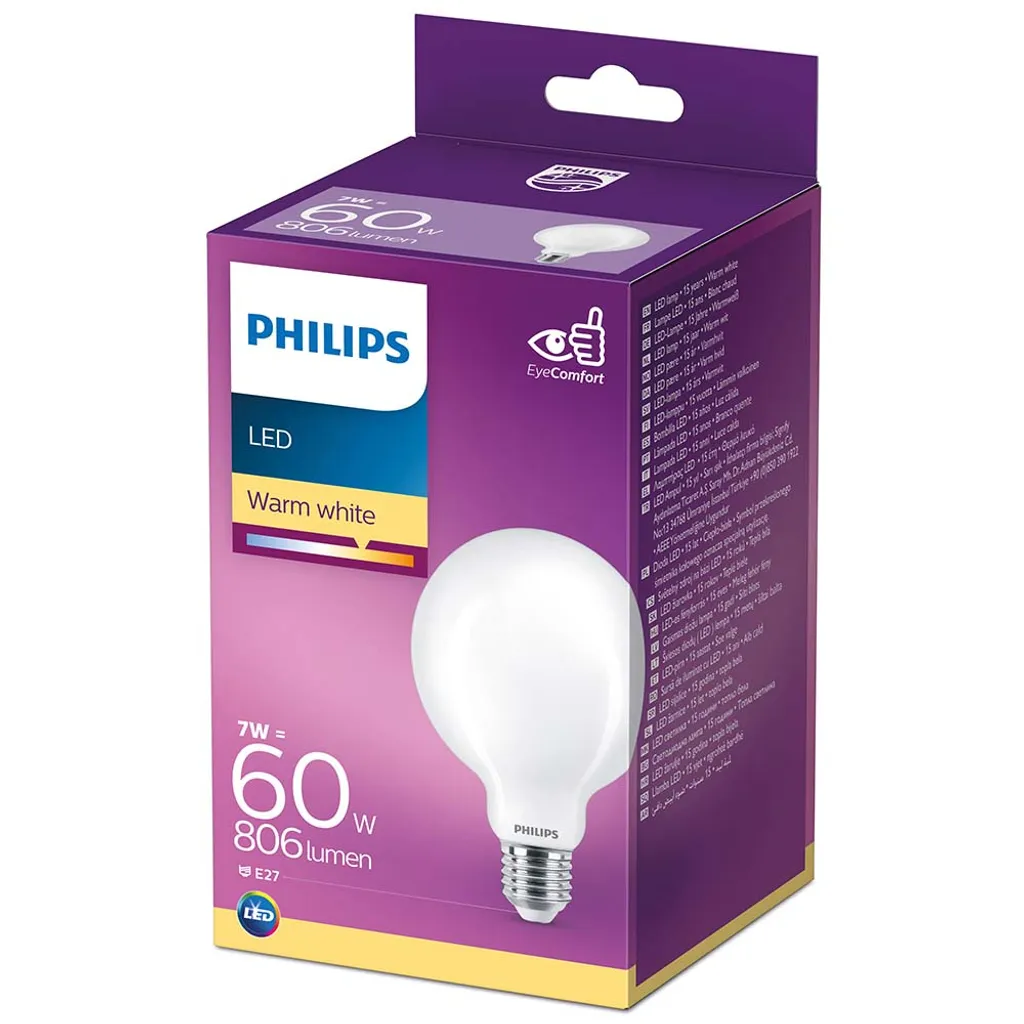 Farbe: , Material: , EEK-Klasse: E, Fasssung: E27, Breite: 95mm, Höhe: 95mm, Leistung: 1x 7W, Lichtfarbe: warmweiss, Lumen: 806lm, Leuchtmittel incl: JA, Zusatzinfos: Vergleich Herkömmliche Lampe: 7W = 60W, Produktart: Philips, LED Kugel Leuchtmittel, Lampe E27 Globe