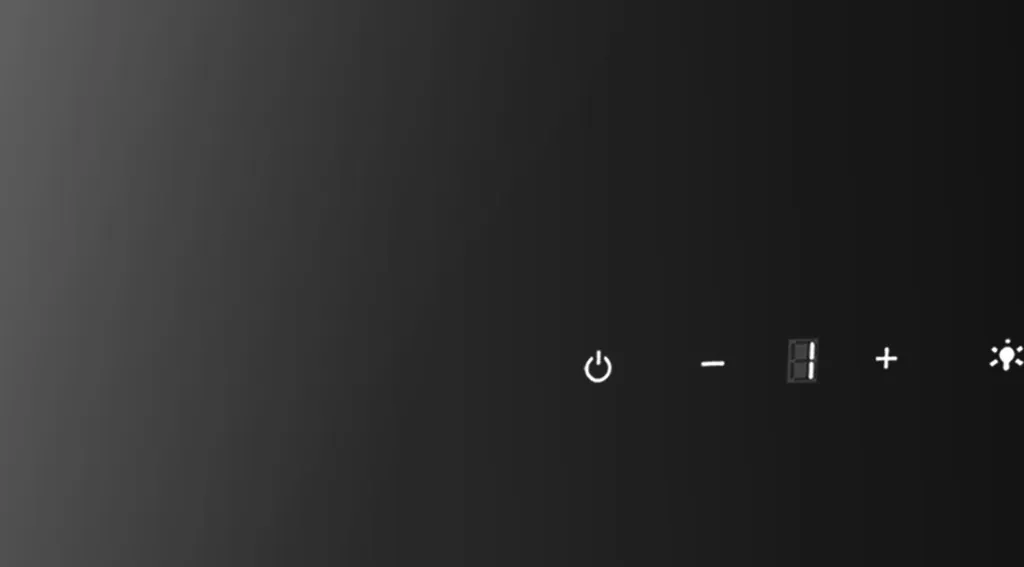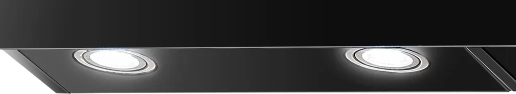 Kopffrei-Dunstabzugshaube aus schwarzem Glas, mit Edelstahl Akzenten. Einfache Bedienung per Touch-Control, ausgestattet mit waschbaren Metallfettfilter und LED-Beleuchtung.