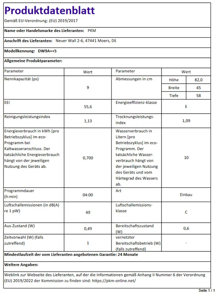 PKM Geschirrspüler DW95 Standgerät – 45 cm breit, weiß, 49 dB, 9 Gedecke NEU