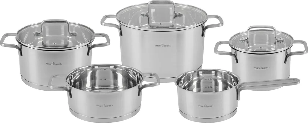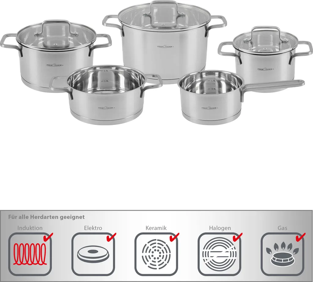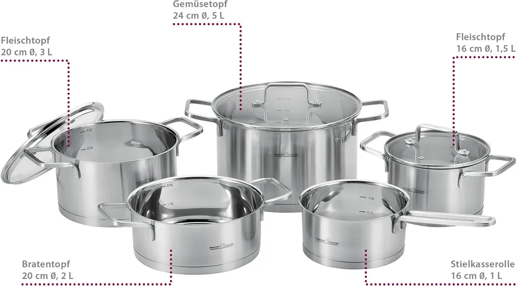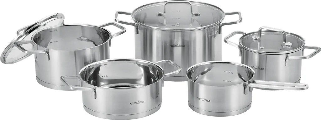 - Lieferumfang: 8 tlg. ProfiCook Kochtopfset; 5 Töpfe und 3 Glasdeckel m. Dampfloch