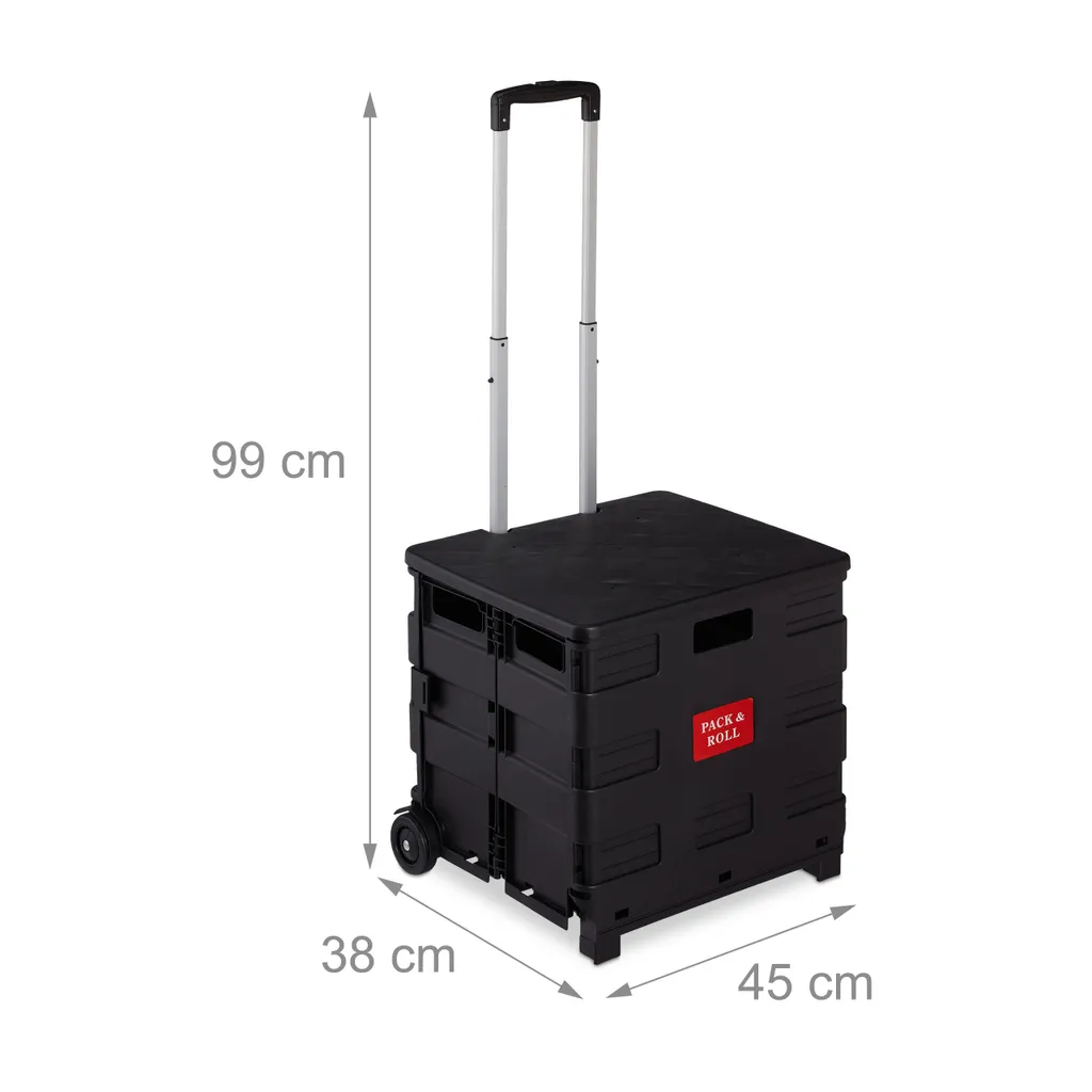 Sie möchten dem Schleppen von Einkäufen und Kisten entgehen? Mit diesem Einkaufstrolley können Sie bequem Ihre Einkäufe nach Hause ziehen, ohne sich Sorgen um Ihren Rücken machen zu müssen. Bis zu 35 kg und 50 l Inhalt passen in die Klappbox mit Rollen – ausreichend Platz für Ihre Wochenvorräte. Nach der Nutzung lässt sich der moderne Hackenporsche schnell und einfach zusammenklappen und nimmt kaum Platz in Anspruch. Dank seines Deckels ist der Trolley für Bus und Bahn geeignet.