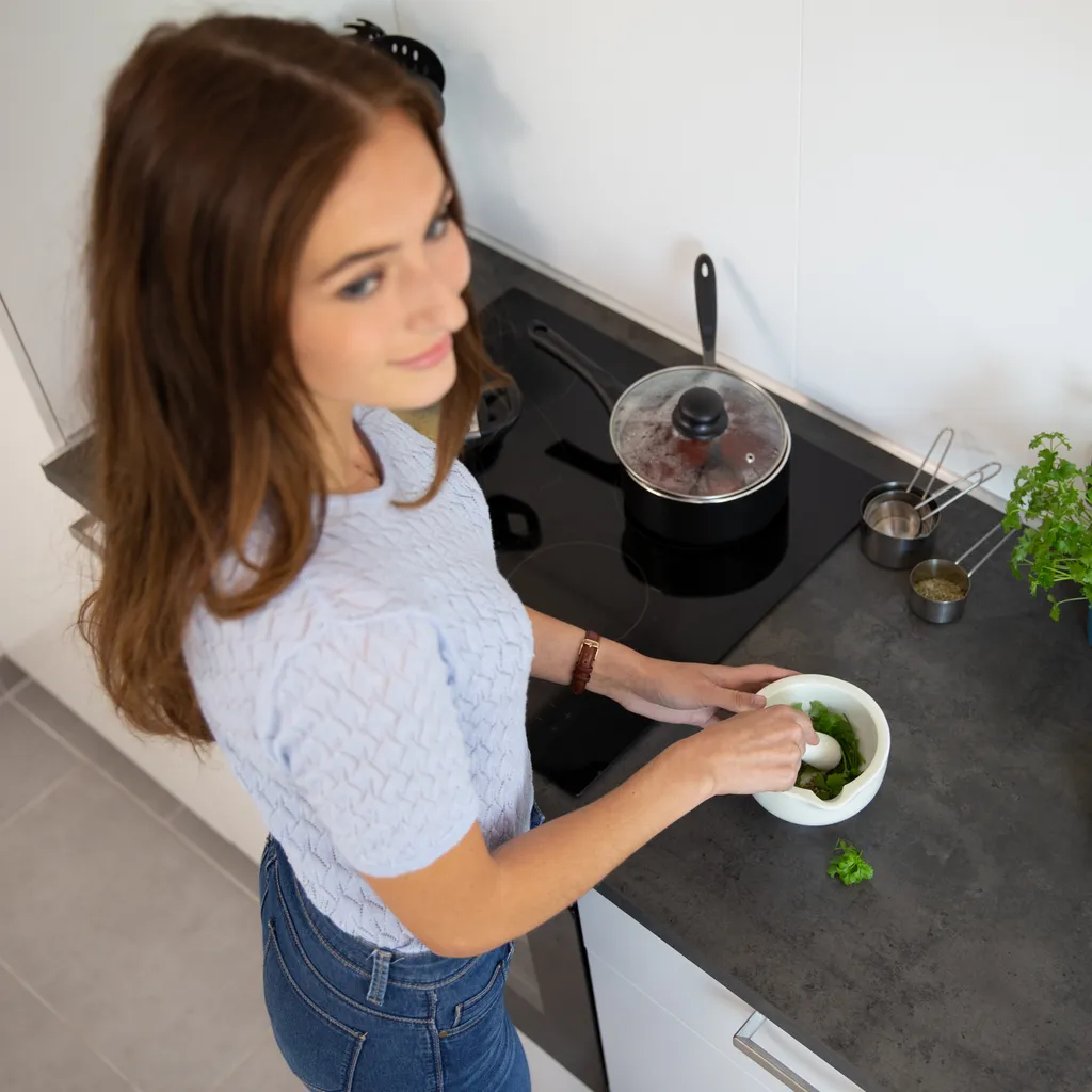 Leckere Saucen und Pasten selber zubereiten – der Porzellanmörser mit Stößel macht es möglich. Er eignet sich für das Zerkleinern von Gewürzen, Kräutern oder Nüssen. So kreieren Sie im Handumdrehen leckere Speisen. Auch für die Fertigung von Salben und anderen Hausmitteln eignet sich der Mörser. Durch das Porzellan ist die Mahlschale geschmacksneutral und lässt sich einfach Reinigen. Das schwere Gewicht macht es so gut wie unmöglich, die Bowl umzukippen