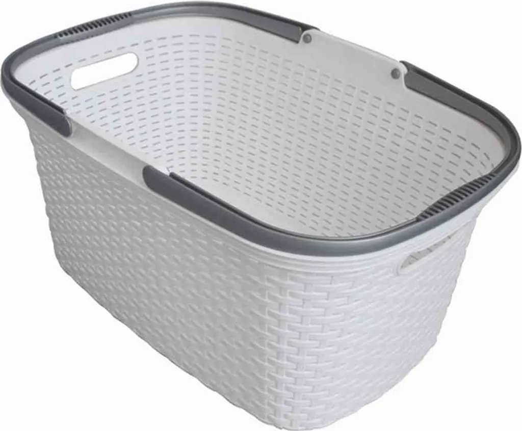 Wäschekorb „Rattan Design“ mit 2 stabilen Tragegriffen, ca. 56 x 37 x 28 cm. 32 Liter Fassungsvermögen. Ideal zum Transport, Sammeln und Sortieren von Wäsche- ineinander stapelbar zum praktischen verstauen von mehreren Wäschekörben – Leicht zu reinigen mit einem feuchten Schwamm oder einfach nur mit Wasser abspülen. Unser Wäschekorb hat eine sehr hochwertige Qualität und ein modernes Design aus Rattan Optik.