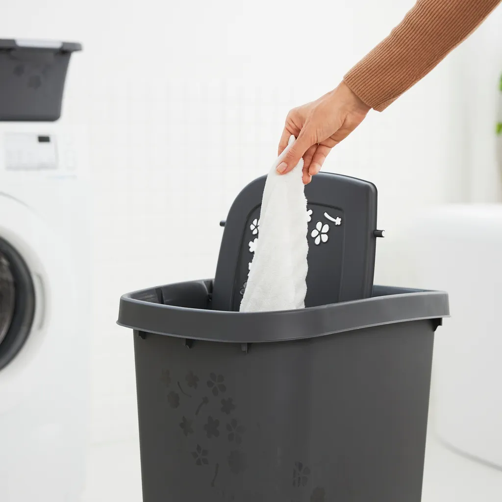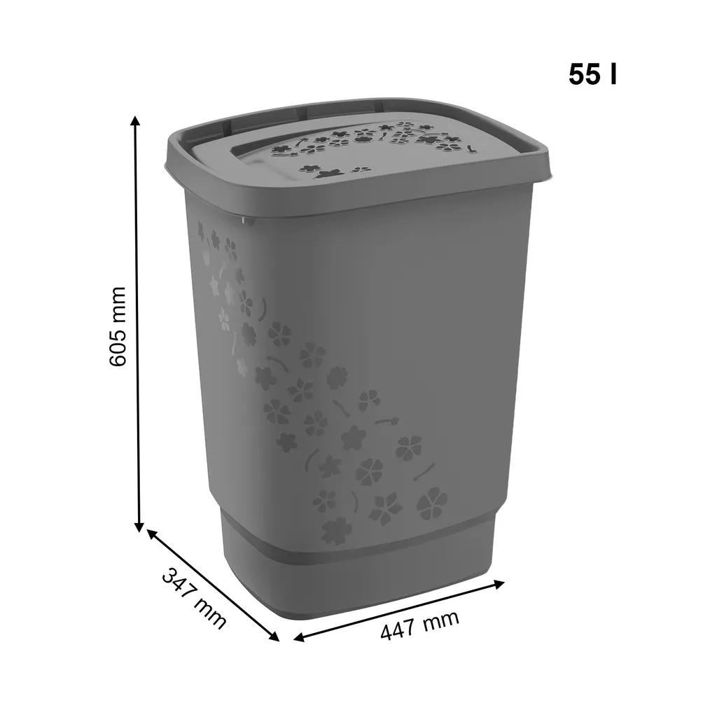 Der Wäschesammler FLOWERS hat ein Fassungsvermögen von 55 l und besteht aus robustem, hochwertig verarbeitetem Kunststoff. Er ist mit einem abnehmbaren Deckel ausgestattet, der über eine Kipp- sowie eine Schwingfunktion verfügt. Zwei integrierte Tragegriffe erlauben einen bequemen Transport des Behälters, Durchbrüche im Deckel sowie im Boden sorgen für eine Belüftung des Inhalts. Das dekorative Blumenmuster wertet den Wäschesammler optisch auf und unterscheidet ihn von herkömmlichen Wäschekörben. Der praktische Haushaltshelfer ist in mehreren attraktiven Farbvarianten erhältlich – bringen Sie frischen Wind in Ihr Badezimmer und sammeln Sie Ihre Schmutzwäsche diskret und platzsparend!