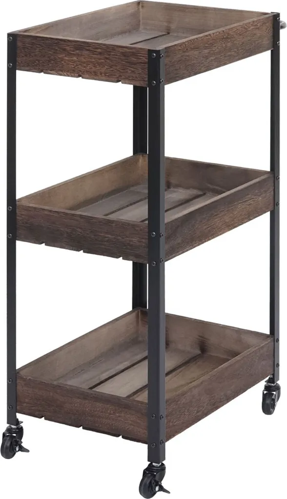 Dürfen wir vorstellen: Ihr neuer Allzweck-Küchenhelfer. Egal ob Sie ihn als zusätzlichem Lagerplatz für Ihre Lebensmittel, als Beistelltisch oder als Servierwagen verwenden wollen – alles kein Problem. Dank der vier Rollen kann er jederzeit bequem bewegt werden und ist an zwei Rollen auch arretierbar. Dadurch kann dieser Küchenwagen sicher abgestellt werden. Die Arbeitsfläche bietet sogar ausreichend Platz ein Essen zuzubereiten. Der Wagen aus Holz ist sowohl robust als auch stabil. Die drei Ablagekörbe können sowohl als Flaschenablage oder aber auch als Ablage für Kochbücher oder sonstige Küchenutensilien genutzt werden. Der individuelle Look wirkt einerseits rustikal, anderseits schafft es Akzente in Ihren heimischen vier Wänden.