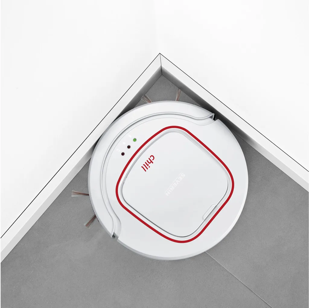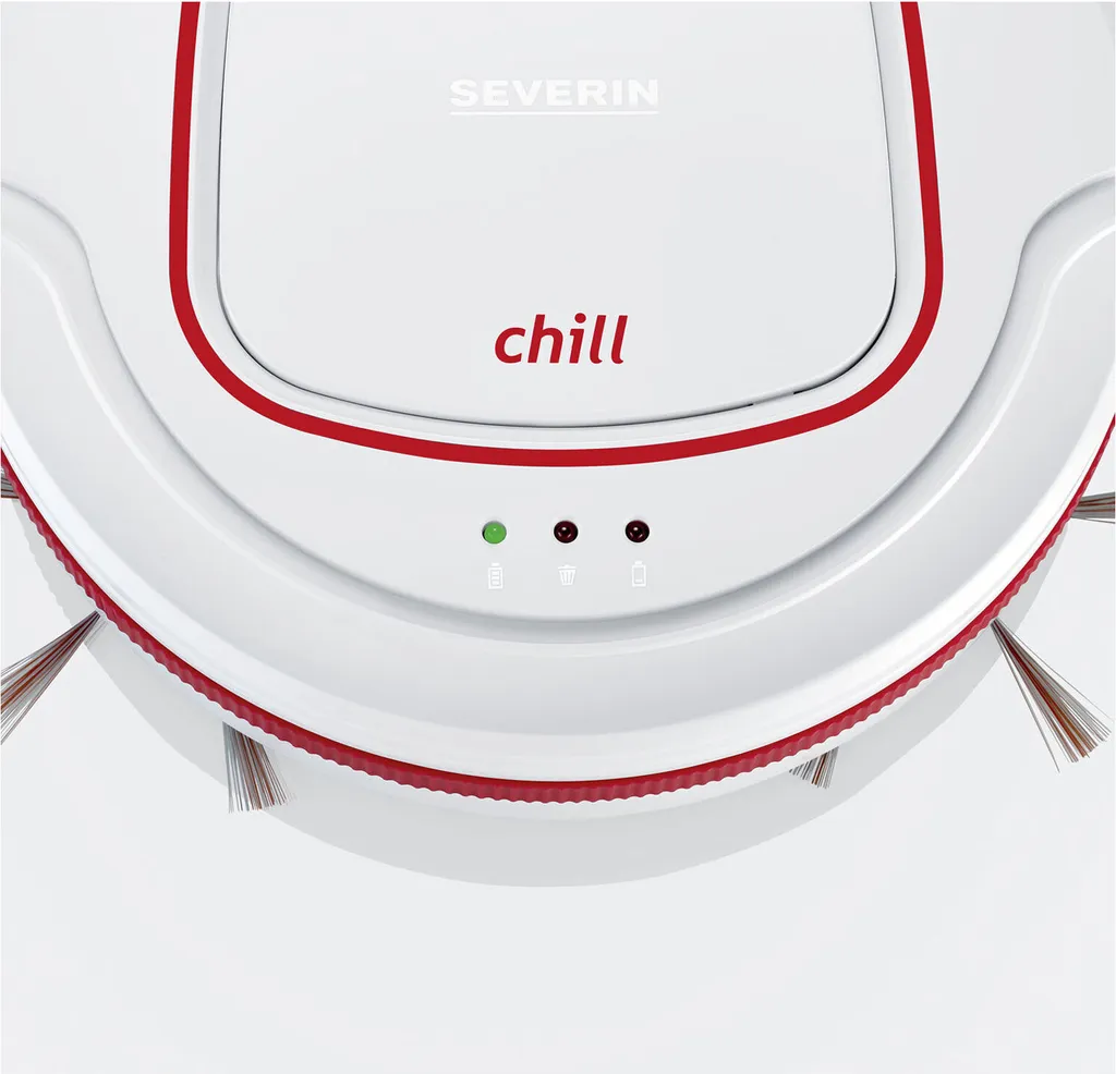 Der Saugroboter RB 7024 ‚Chill‘ von Severin reinigt Hartböden und kurzflorige Teppiche sorgfältig und gewissenhaft. Der Roboter wartet mit 3 Reinigungsstufen auf und säubert mit einer Akkuladung bis zu 90 Minuten lang – und das bei einem Betriebsgeräusch von etwa 65 dB(A). Die flache Konstruktion von nur 7 cm Höhe gestattet dem Saugroboter ‚Chill‘ auch die Reinigung unter Möbeln. Angesichts moderner Sensortechnik registriert der Roboter auch Treppen und verhindert so Abstürze.