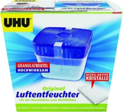 Der kompakte, 17,0 x 12,0 x 17,0 cm große UHU Original Raumentfeuchter funktioniert durch Wasserabsorption, verbraucht dadurch keine Energie und arbeitet geruch- und geräuschlos.